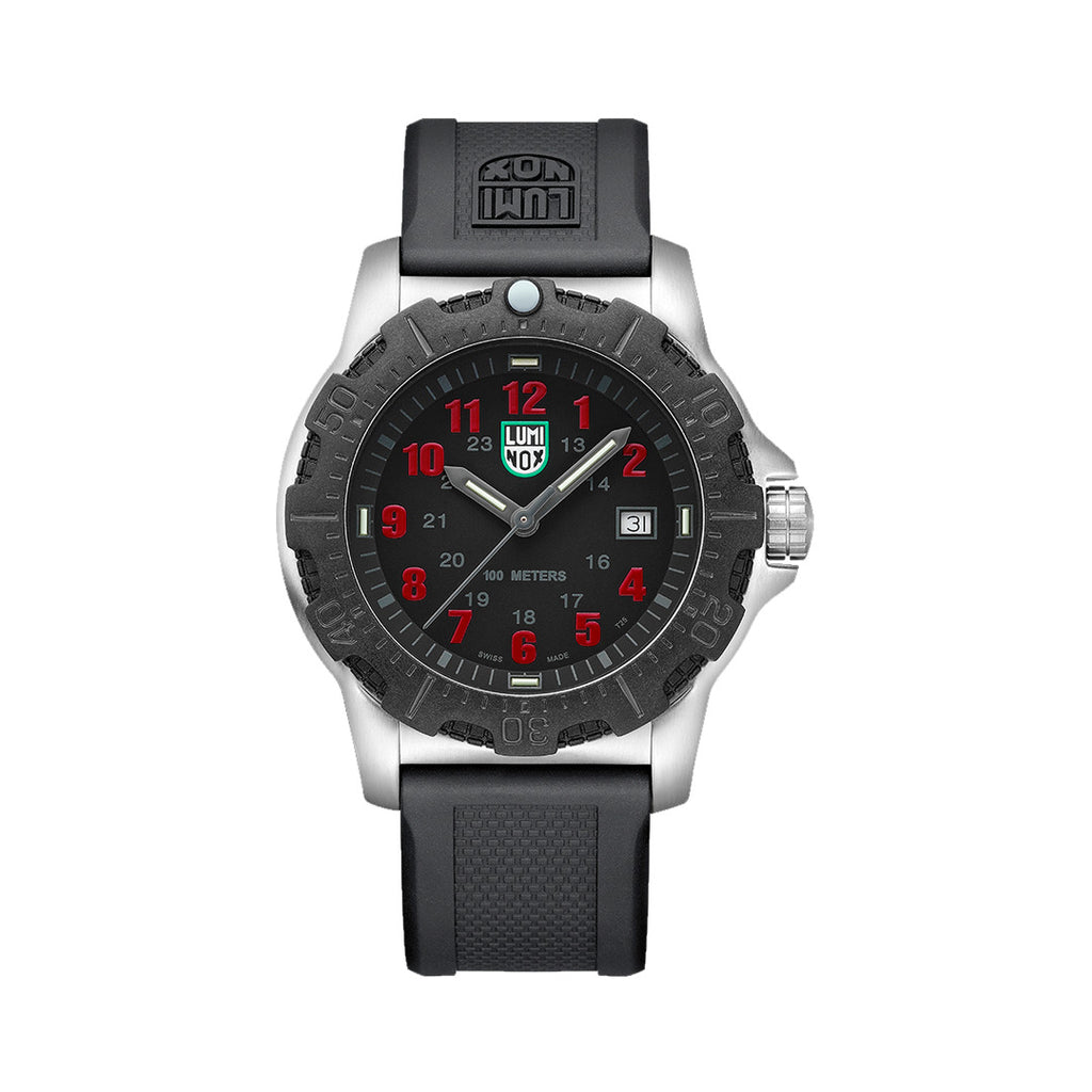 The Manta Ray Steel is durable, legible and specially designed for real world use. This model with a dark grey dial and contrasting red numbers features a 45mm stainless steel case and caseback, as well as a CARBONOX™ unidirectional ratcheting bezel. Water resistant to 100 meters, it comes equipped with a black PU strap adorned with a stainless steel signature buckle. Its proven Luminox Light Technology lighting system guarantees self-powered readability in the night. "Always Visible" for 25 years.