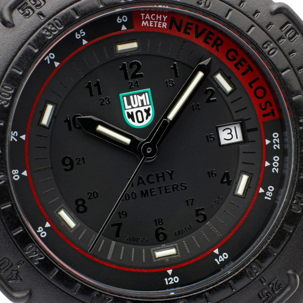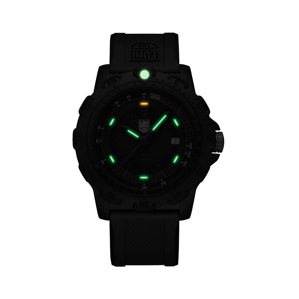 The Never Get Lost watch is a durable timepiece housed in a 45mm CARBONOX™ case. It features a black-out dial, a unidirectional ratcheting bezel and a CARBONOX™ caseback. Water resistant to 100 meters, it comes equipped with a black PU strap adorned with a stainless steel signature buckle. Its proven Luminox Light Technology lighting system guarantees self-powered readability in the night. "Always Visible" for 25 years.