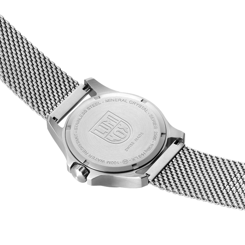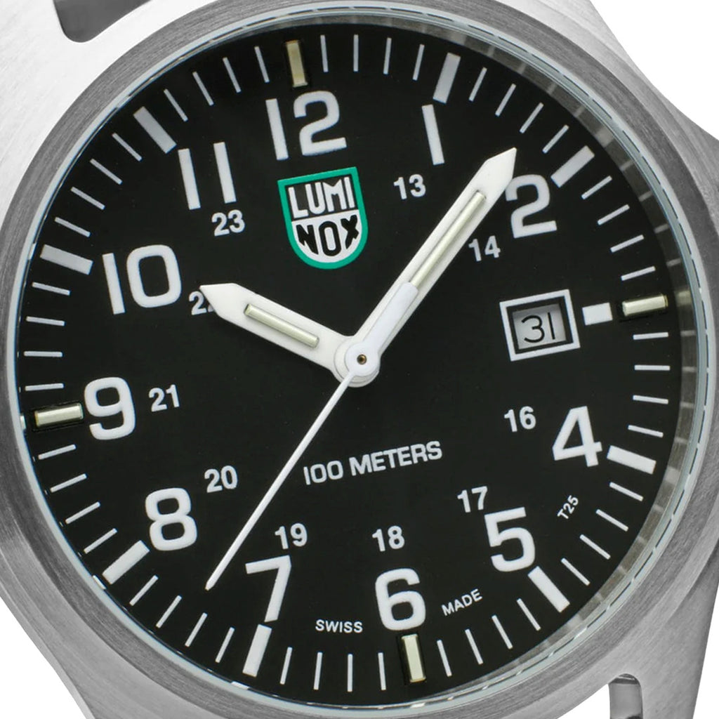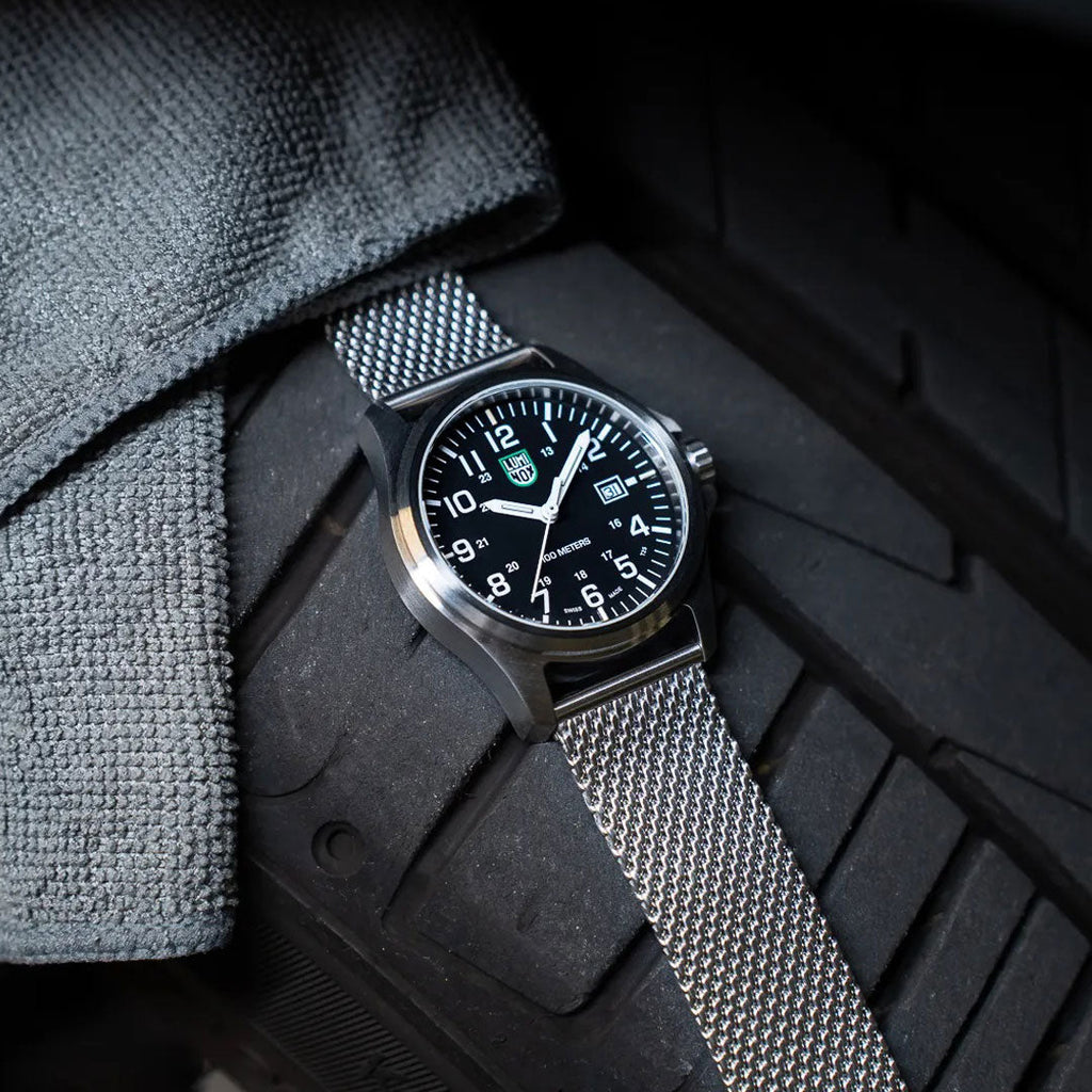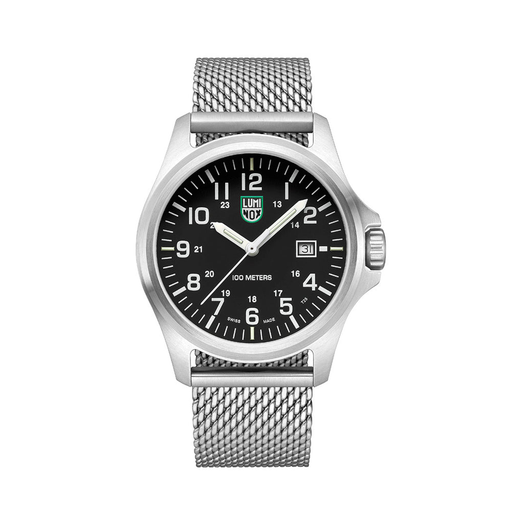The Patagonia Steel is a classic timepiece combining rugged yet simple styling with a clean modern look that takes you seamlessly from the field to the boardroom. Housed in a 43mm stainless steel case, it is water resistant to 100 meters. In addition, it features an instantly-readable black dial with white numbers and comes with a stainless steel mesh band adorned with a stainless steel signature buckle. This watch is equipped with the proven Luminox Light Technology lighting system. "Always Visible", self-powered, for up to 25 years.