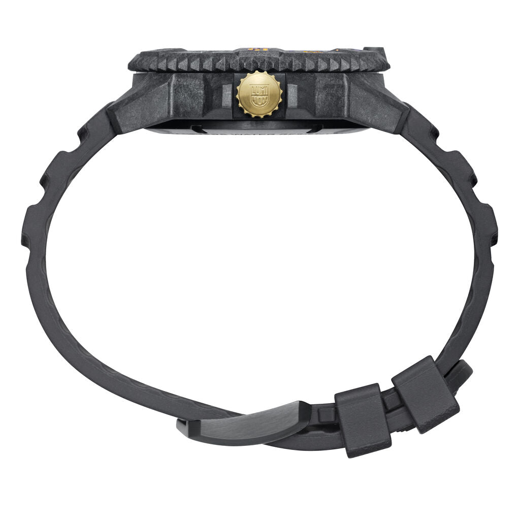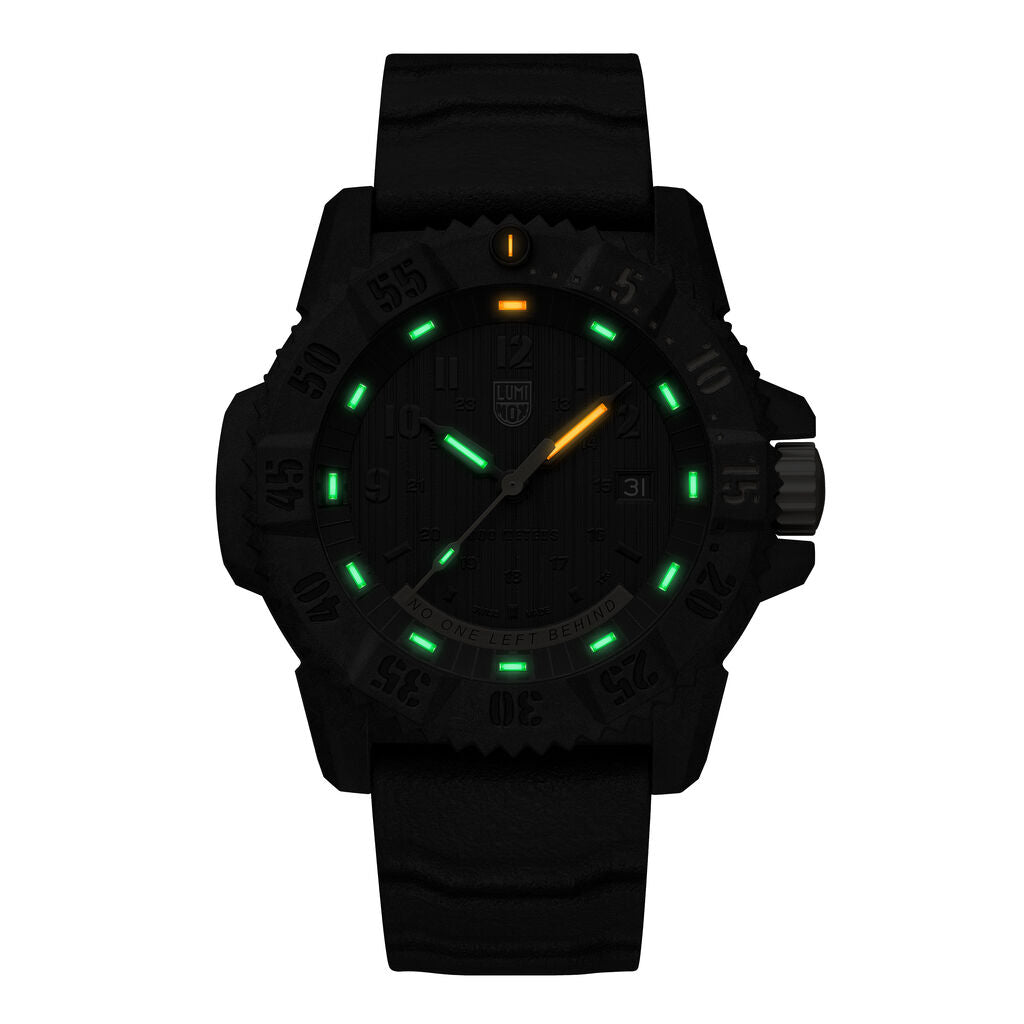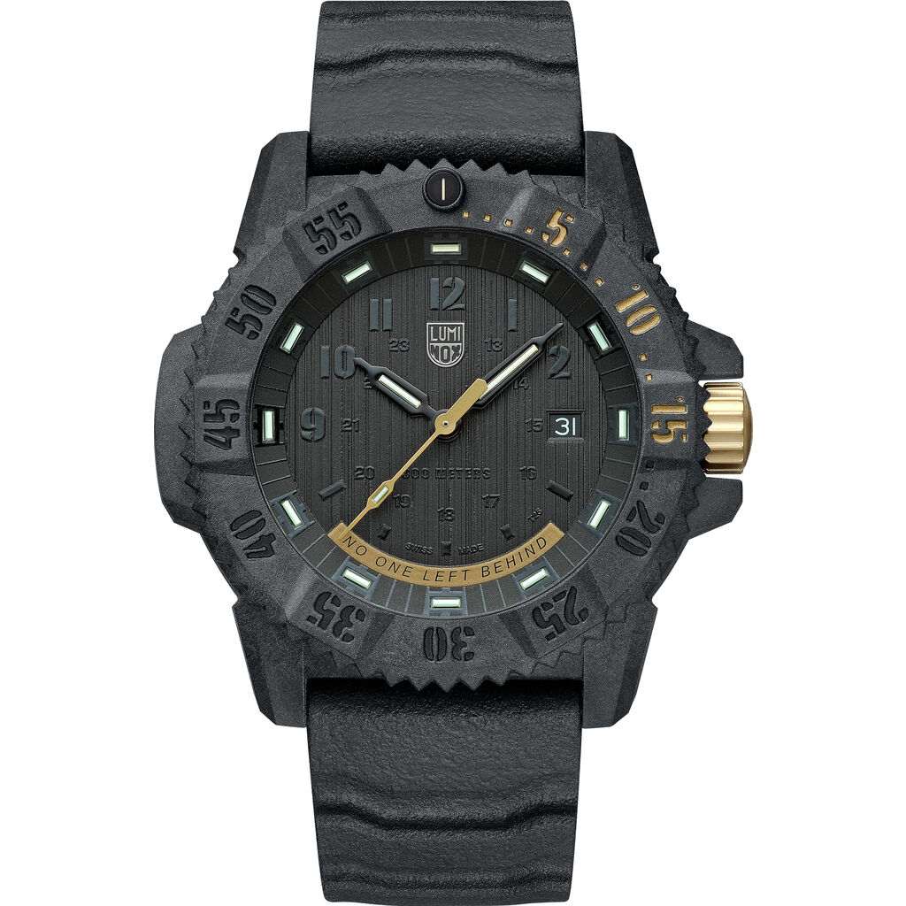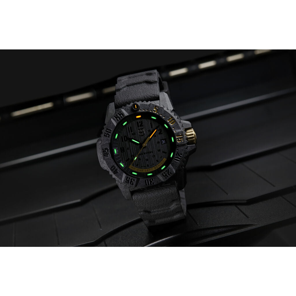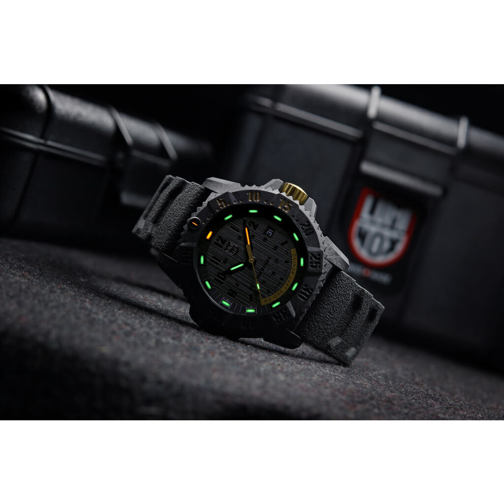 One of the newest additions to the Luminox Master Carbon Seal 3800 Series quartz wristwatch. This authentic men's watch has a fashionable and elegant black color design, is stable quality, is well maintained, and can be used for a long time. Made of high-quality CARBONOX™+ and uses a black dial with anti-reflection sapphire glass with black rubber or black webbing strap. The lithium battery gives 96 months of long-life service. Fully water resistant gives you relaxation in rainy weather.