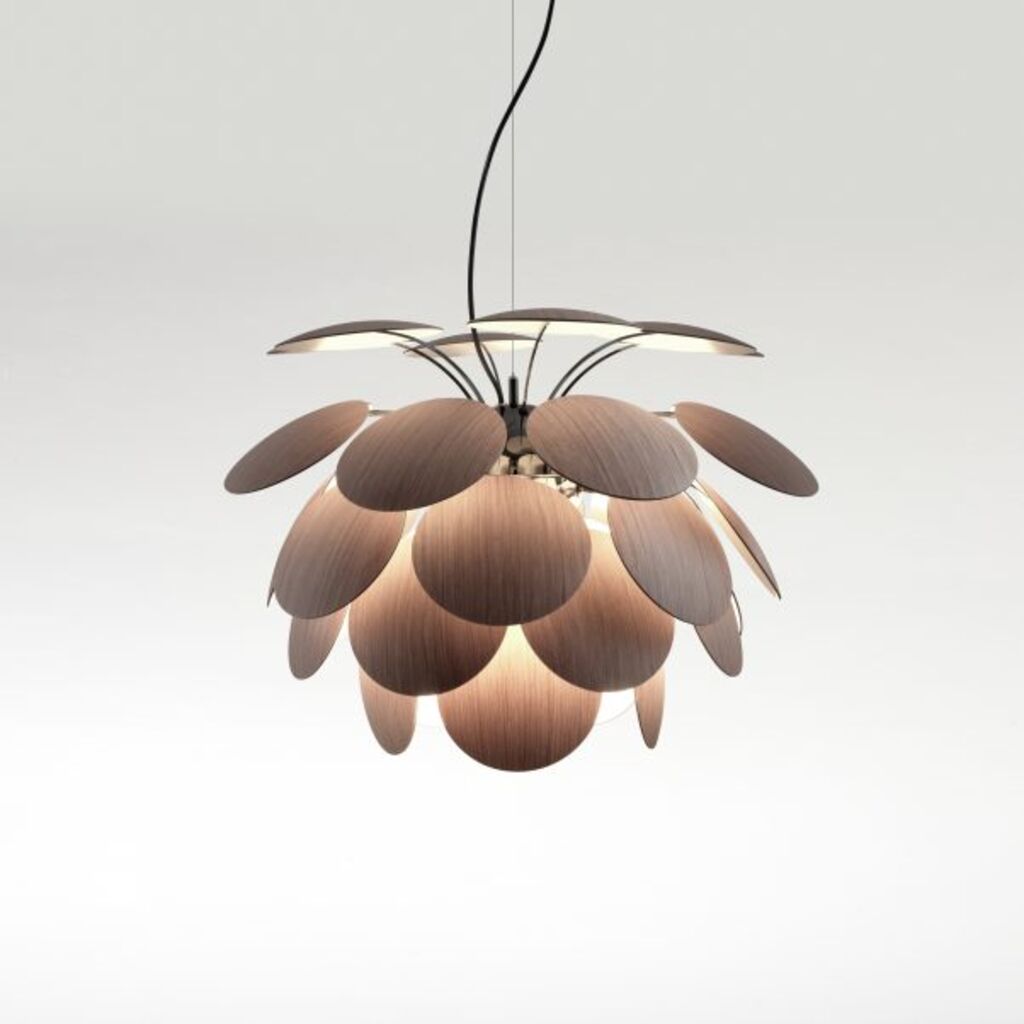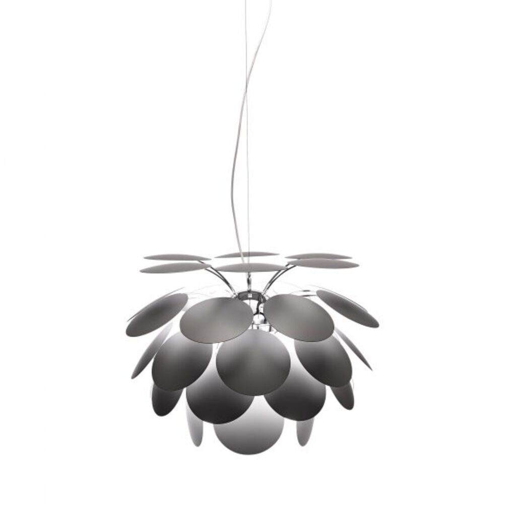 Designed by Christophe Mathieu, the exuberant and attractive Discoco Pendant Light by Marset offers suggestive, highly effective lighting. Thirty-five round lacquered ABS discs vibrantly reflect the internal light source in unique ways depending on their angle. Direct illumination is provided as well from the pendant light's underside. The metal bars holding the discs in place are connected to a chrome sphere, which provides glittering reflections.