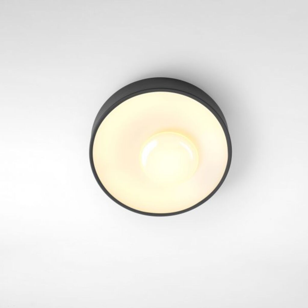 Clara del Portillo and Alex Selma of Valencia-based multidisciplinary studio Yonah were inspired by the day dawning along the horizon with their ceiling fixture Sun. A circular lacquered iron case contains the concave polycarbonate diffuser that surrounds the LED light source. Additionally, a second diffuser in blown opal glass is placed off-center. As each of the materials reflects the light differently, the combined effect is a luminous glow much like the moment before sunrise.