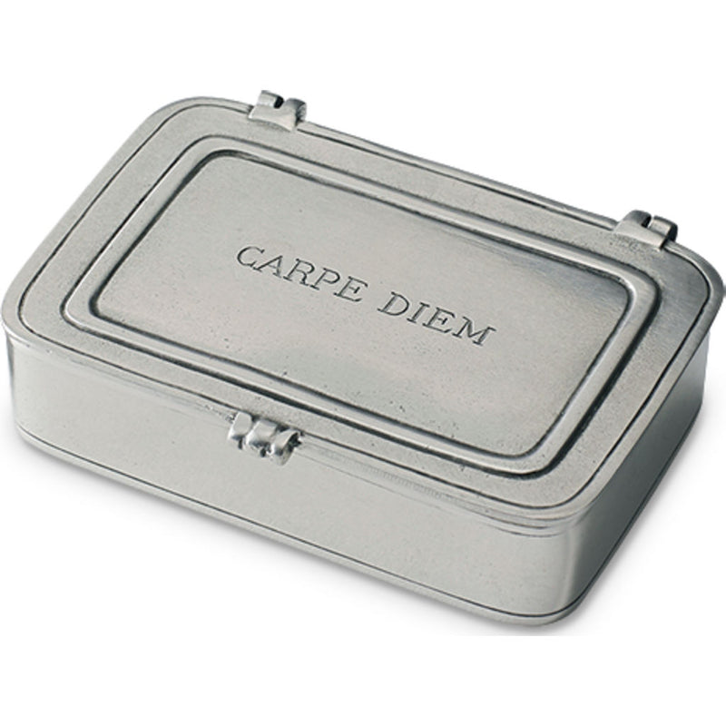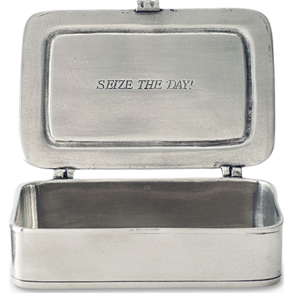 The Pewter Match Small Carpe Diem Box is the perfect gift for anyone in your life! This beautiful Pewter box is handmade in northern Italy. It is a great addition to your home or office to remind you to seize the day!
