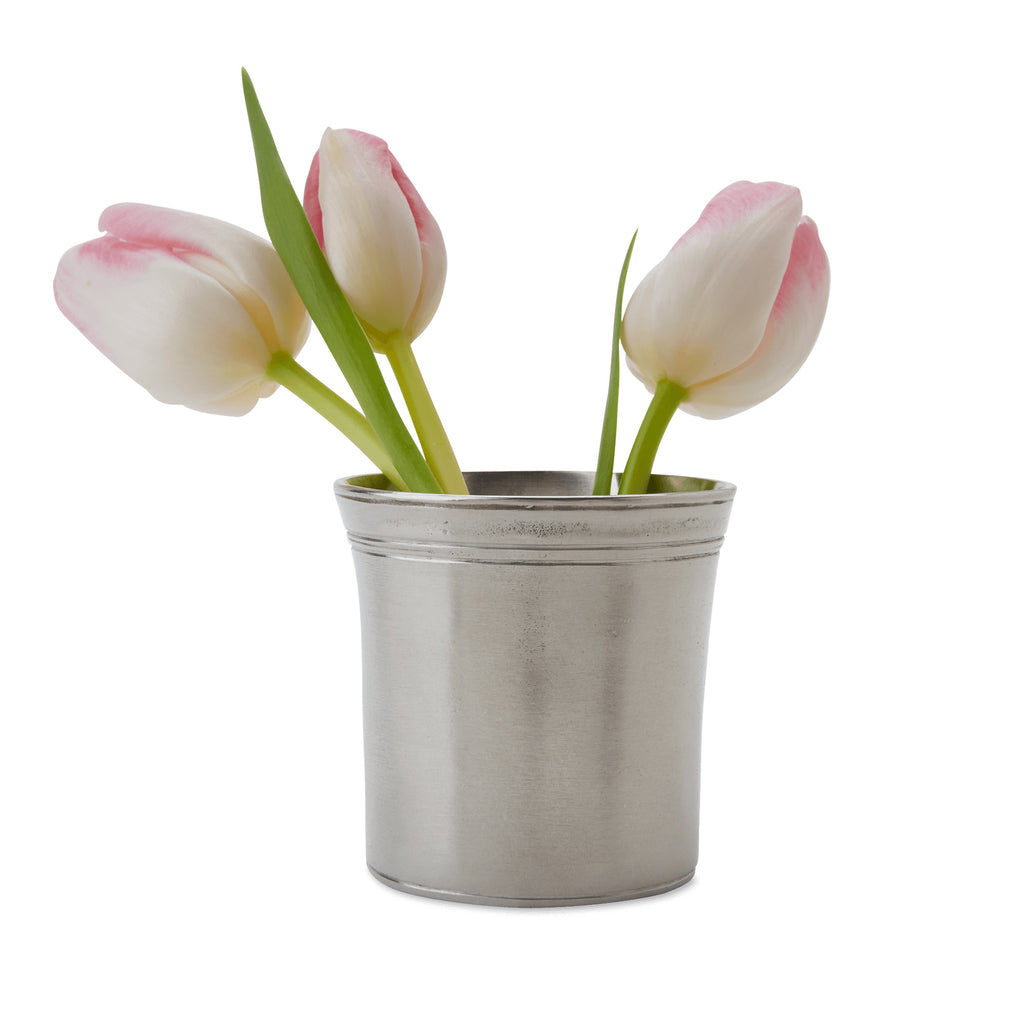 A versatile accent with a timeless design, the all-pewter Piemonte Cup delights as a toothpick or garnish holder at the bar, a cotton swab holder on the vanity, or a the perfect petite flower vase on a breakfast tray. 2.6" H x 2.6" D