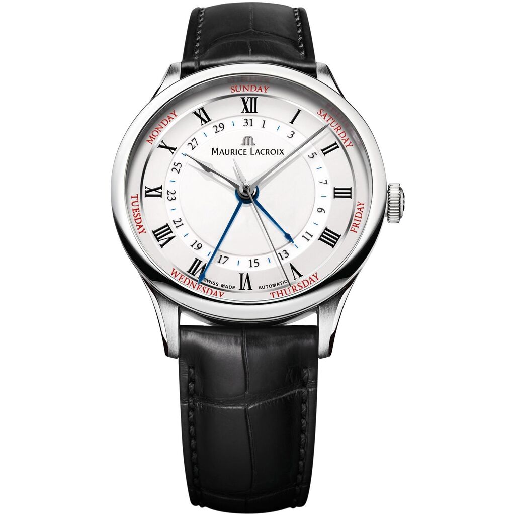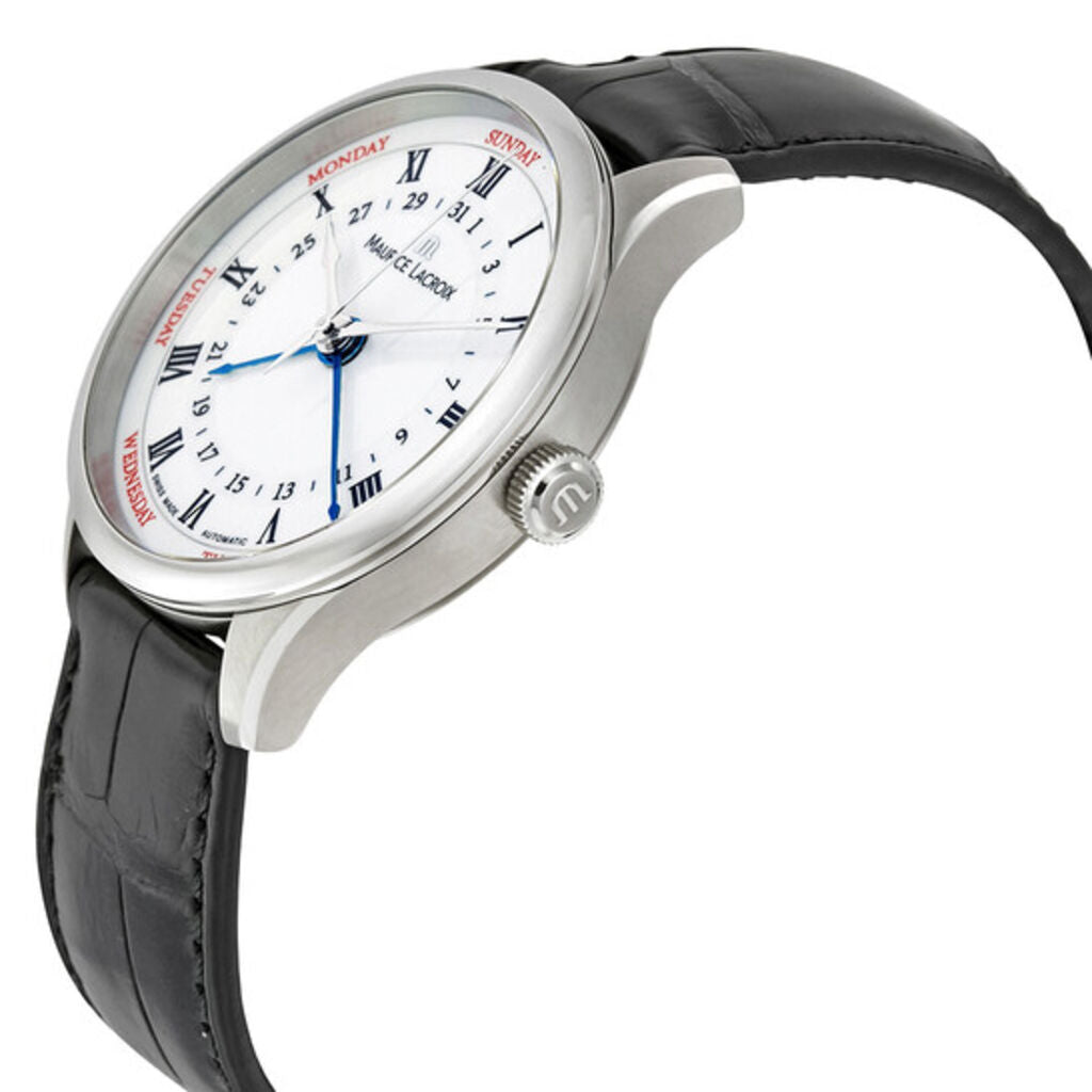 Stainless steel case with a black leather strap. Fixed stainless steel bezel. Lacquered white dial with silver-tone hands and Roman numeral hour markers. Date scale around an inner ring. Days of the week displayed around the outer rim. Dial Type: Analog. Date display around the outer rim and date display around the inner ring. Maurice Lacroix calibre ML 159 automatic movement, containing 26 Jewels, bitting at 28800 vph, and has a power reserve of approximately 38 hours. Scratch resistant sapphire crystal. Pull/push crown. Transparent case back. Round case shape.