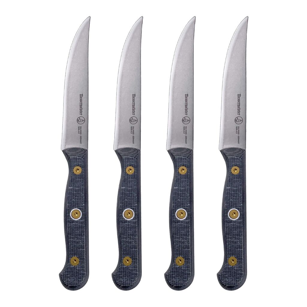 The Messermeister Custom 5” Steak Knife has a fine edge to effortlessly trim and cut meat without tearing. This slim and compact design is elegantly styled to look great with any place setting. The Custom base model handle is precison milled from an incredibly tough material made of reclaimed canvas and natural non-phenolic resin. It has a natural subtle texture for a more secure grip.