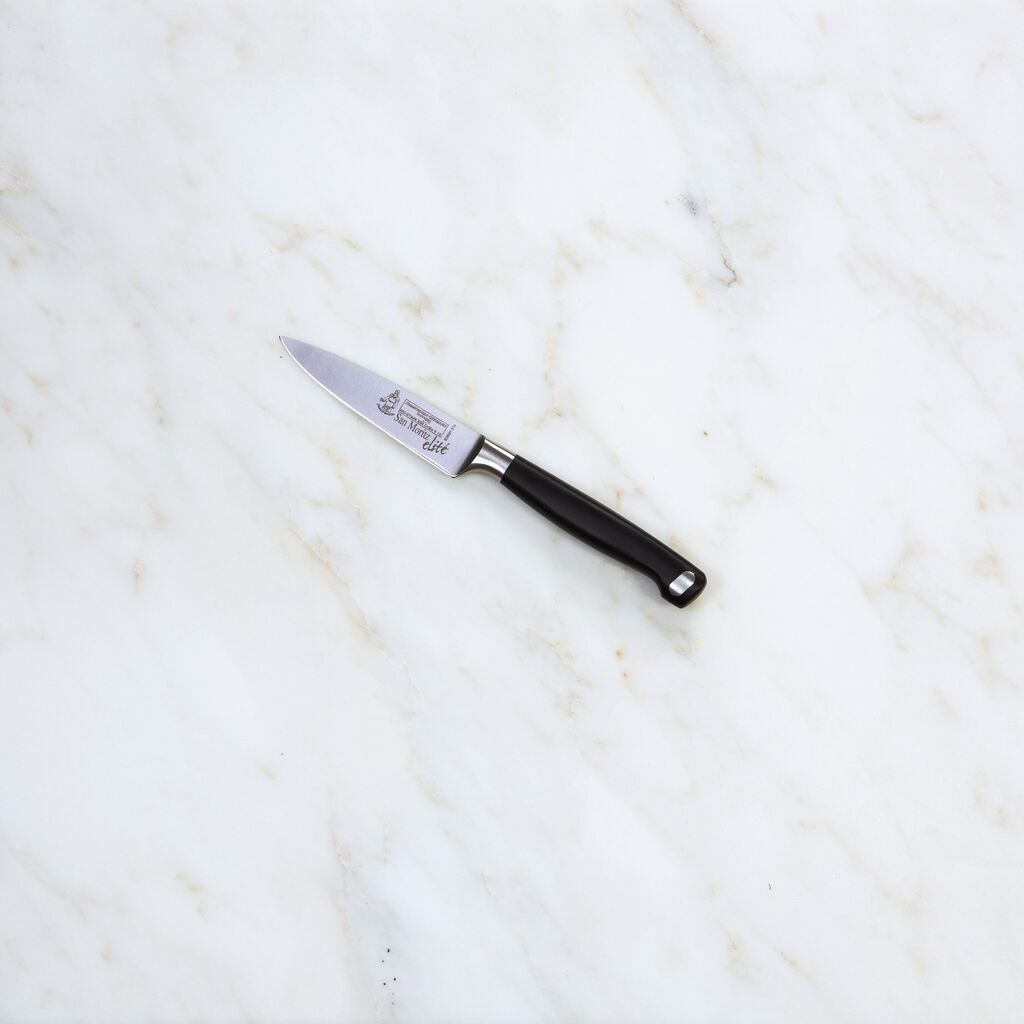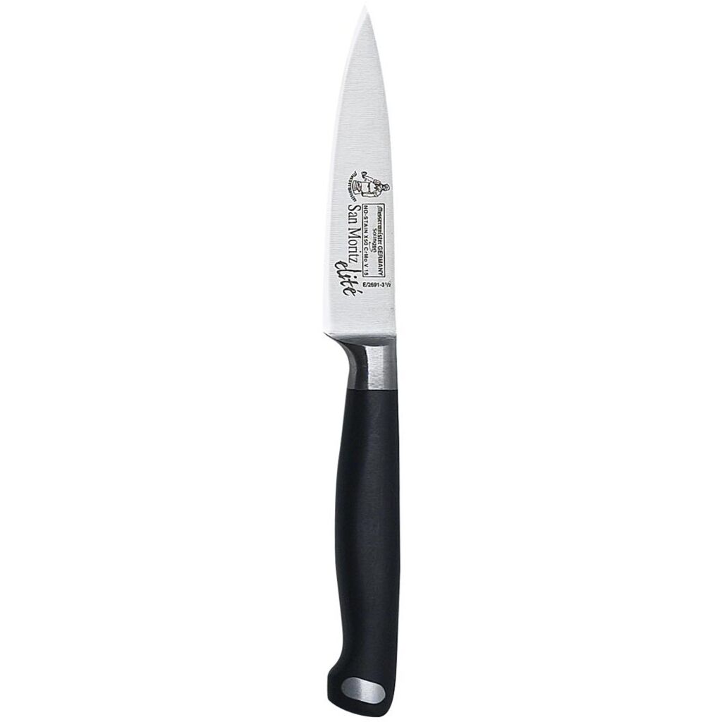 You will find yourself using the Messermeister San Moritz Elite Paring Knife daily for a variety of tasks requiring accuracy. This knife has a fine edge blade that tapers to a point and is designed to be an all-purpose knife, similar to a chef's knife, except smaller. The compact blade and molded handle will facilitate trimming, peeling and slicing of produce.
