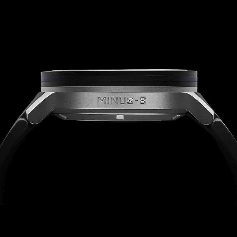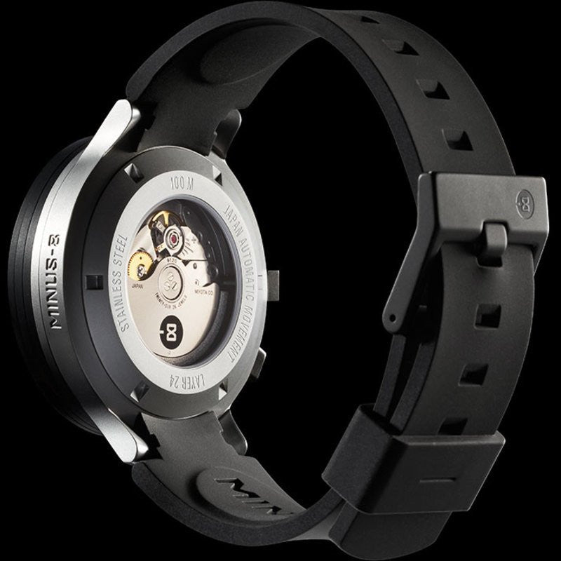Anyone can wear a watch. But not everyone has the great taste and style know how to wear the elegantly minimalist Minus-8 Layer 24 Black/Black Automatic watch. Combining precise watch making techniques with a totally unique and interesting aesthetic, Minus-8 created a masterpiece that leaves all other watches in the dust. A proprietary design of six layered 316L bonded steel bands produces a visual stadium effect from the exterior of the watch face to the interior. The balance wheel's movement is visible through the clear sapphire crystal face back. A design this superb can't be worn by just anyone.