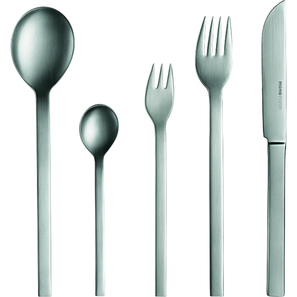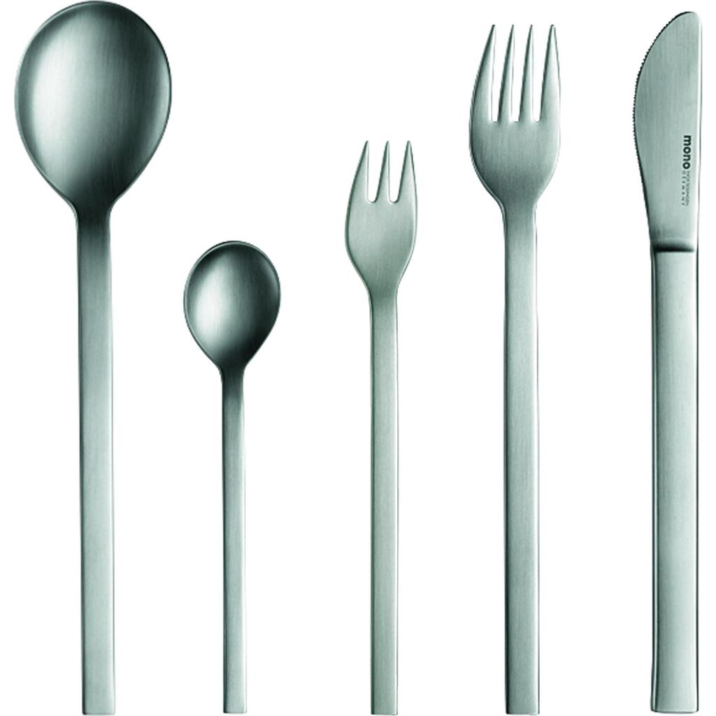 Launched in 1959, mono-a heralded a new era, rejecting any kind of decorative elements. Crafted in close to 30 steps requiring manual expertise and knowledge. This set comes in both original and brilliant finishes, polished by hand, as well as the option for a long or short knife blade. The short blade set was designed with proportion in mind, maintaining the ratios between top and bottom throughout the set.