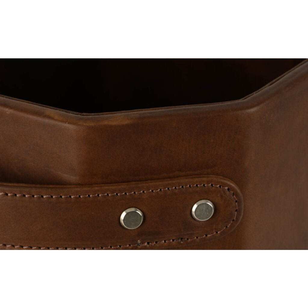 A striking and unexpected addition to any well-appointed office, our beautiful waste basket is the luxurious choice when the details matter. A faceted wooden core is tightly wrapped in Baldwin Oak leather to create a receptacle that is as sculptural as it is functional. Low-profile handles and their brass rivets make handsome details. This piece is corner-office ready.