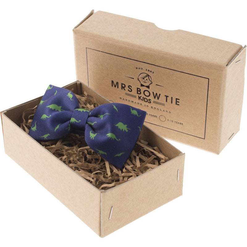 Mrs Bow Tie designed the Dinosaurs Junior Bow Tie with different types of dinosaurs in green on navy blue fabric. Pre-tied, this bow tie is constructed to maintain its shape. These bow ties are adjustable in size to keep your little one comfortable and easily fastens with a hook and eye.