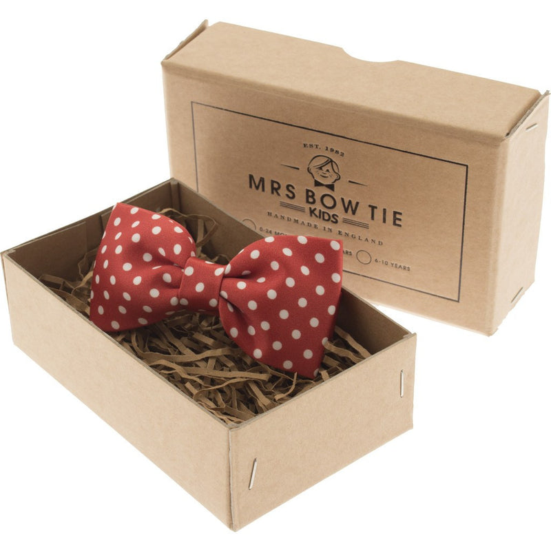 Mrs Bow Tie designed the Dotty Junior Bow Tie with white dots on bright red fabric. Pre-tied, this bow tie is constructed to maintain its shape. These bow ties are adjustable in size to keep your little one comfortable and easily fastens with a hook and eye.