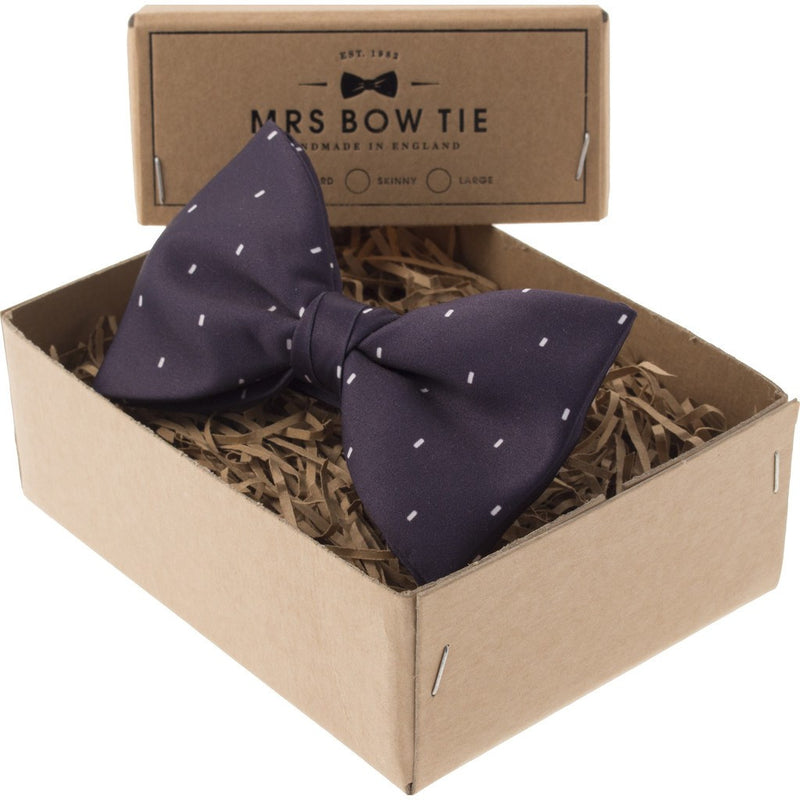 Mrs Bow Tie crafts the Dr. Who 50th Anniversary Bow Tie with white flecks on dark purple fabric. As worn in the 50th anniversary episode, this bow tie pays homage to 'The Doctor' himself. Matt Smith, the 11th Dr. Who, is never seen leaving the Tardis without his bow tie. Pre-tied, this bow tie is constructed to maintain its shape. These bow ties are adjustable in size for ultimate comfort and quickly fasten with a hook and eye.