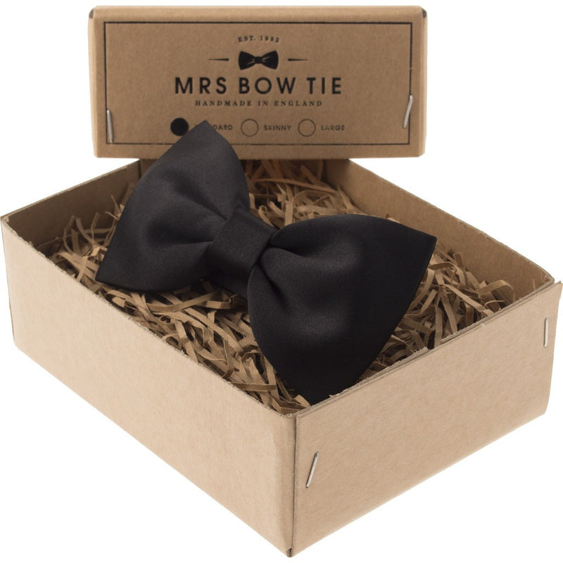 Mrs Bow Tie crafts the Satin Bow Tie with all black fabric for a classic look. Pre-tied, this bow tie is constructed to maintain its shape. These bow ties are adjustable in size for ultimate comfort and quickly fasten with a hook and eye.