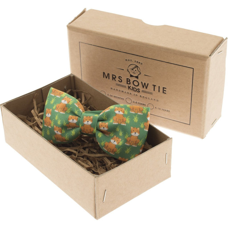 Mrs Bow Tie designed the Timmy Tiger Junior Bow Tie with little crouching tigers on green material. Pre-tied, this bow tie is constructed to maintain its shape. These bow ties are adjustable in size to keep your little one comfortable and easily fastens with a hook and eye.
