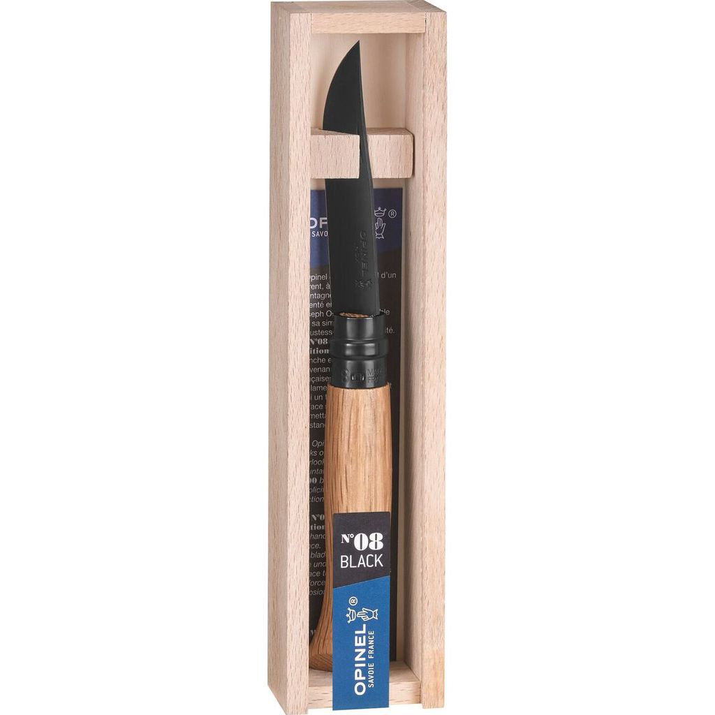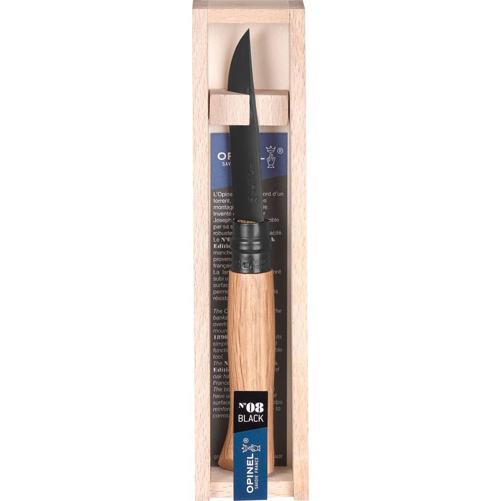 Opinel's classic No. 8 knife is crafted with a black Sandvik Stainless Steel for a modern look. The folding pocket knife with oak handle is versatile to be an all around camping gear. Small enough to be a pocket knife but functional to be used on food when needed. The 3 1/4" blade prevents it to be considered a weapon in most states. The Virobloc safety rings makes the handy knife safe to carry daily. Feel your survival insincts kick in with Opinel's knife rustic look.
