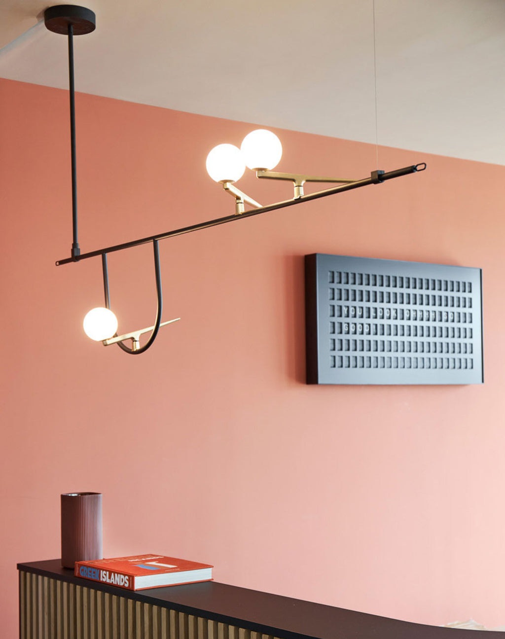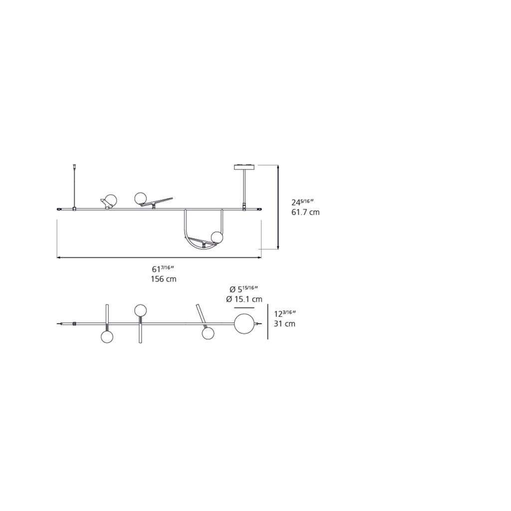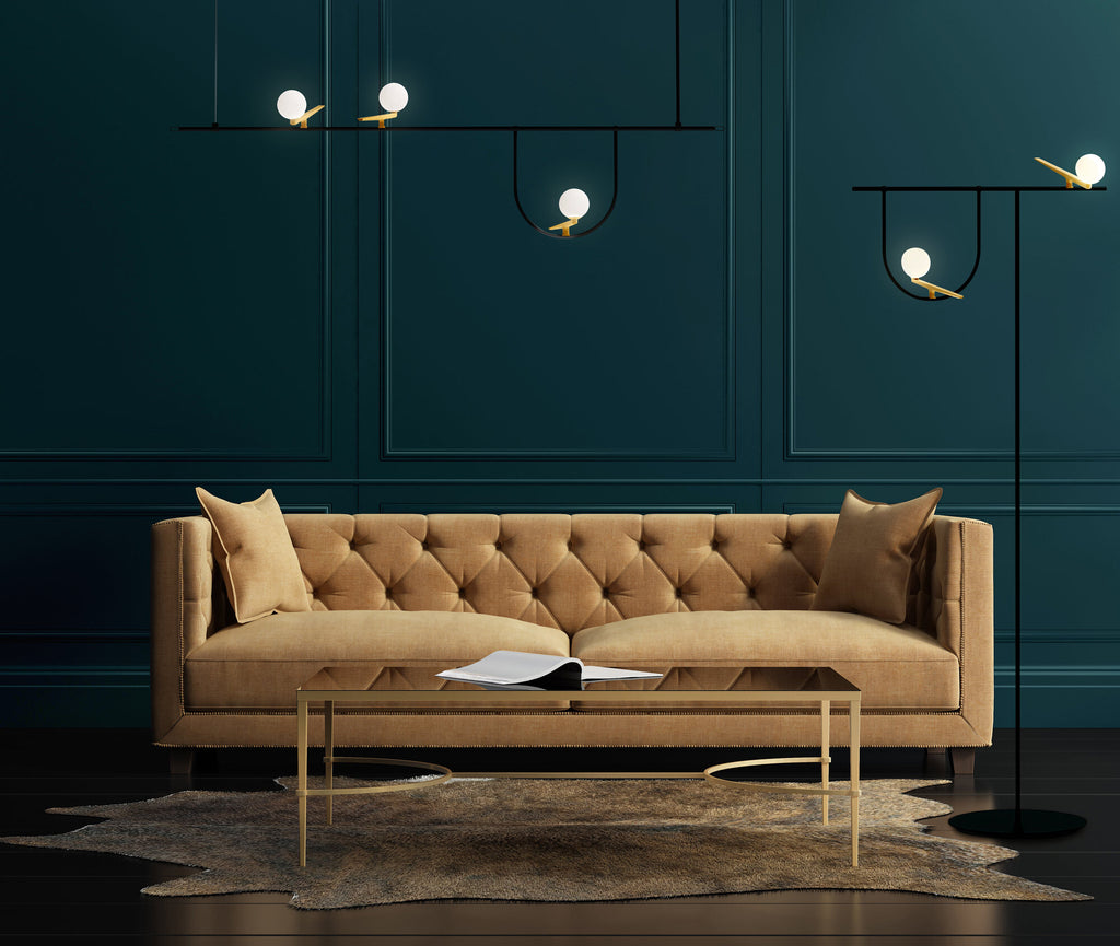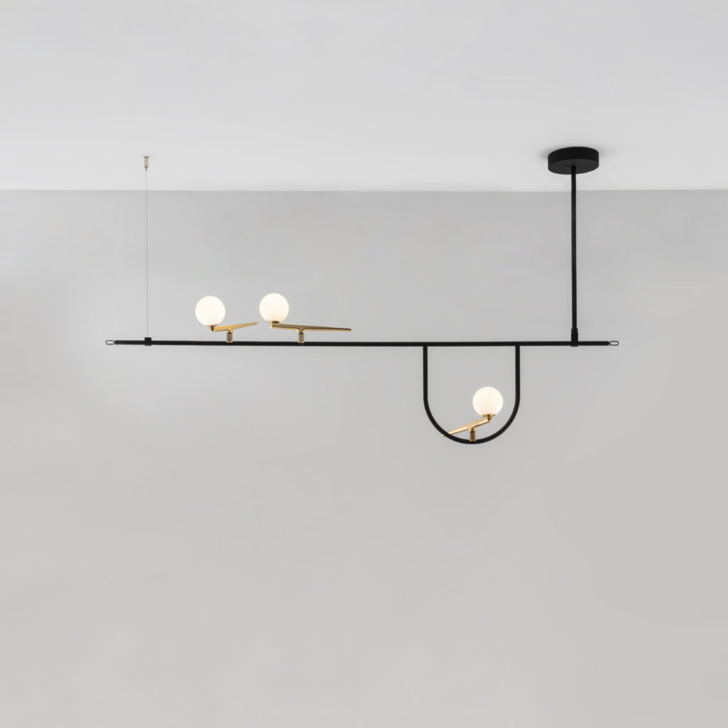The Yanzi Linear Suspension offers a sharp, modern look with a touch of whimsy that is sure to be a unique addition to any space. It features a slim linear Black steel body that is resembles a bird's perch, with three Opal glass orb diffusers set into Brushed Brass finished bird bodies, with two set atop the main rod and the third resting in a loop hanging below.