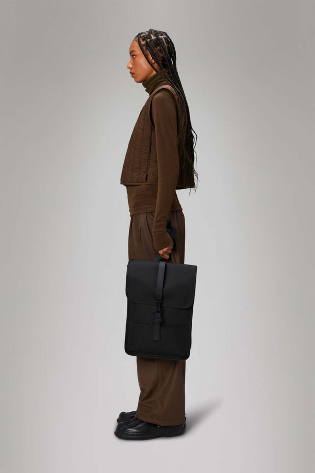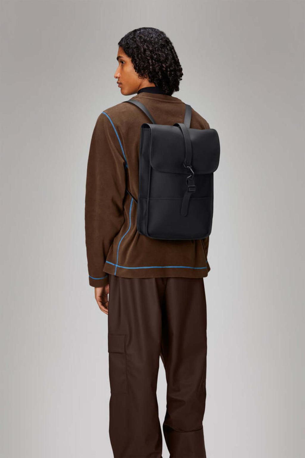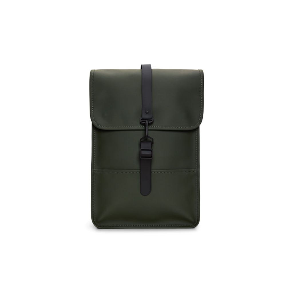 Rains Backpack Mini is a downscaled version of Backpack, a true Rains classic. The silhouette is characterized by its prominent flap and central strap with carabiner closure. This clean and ever-contemporary waterproof rucksack features an internal laptop pocket, a main compartment, and a concealed external phone pocket on the back panel. Backpack Mini is cut in Rains signature waterproof PU fabric, engineered for carrying strength, durability, and a smooth feel.