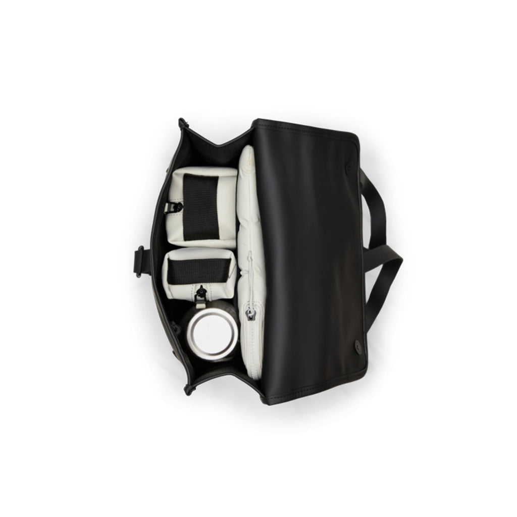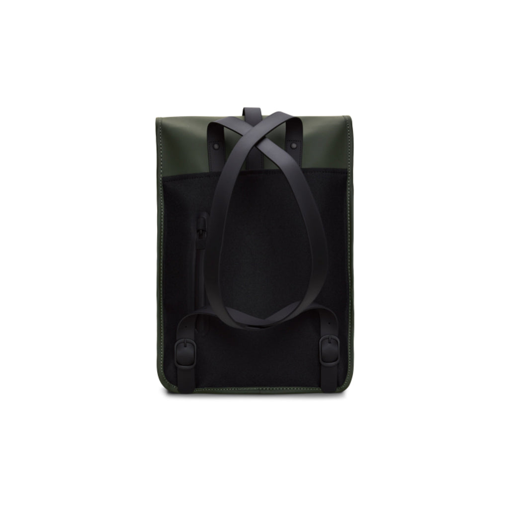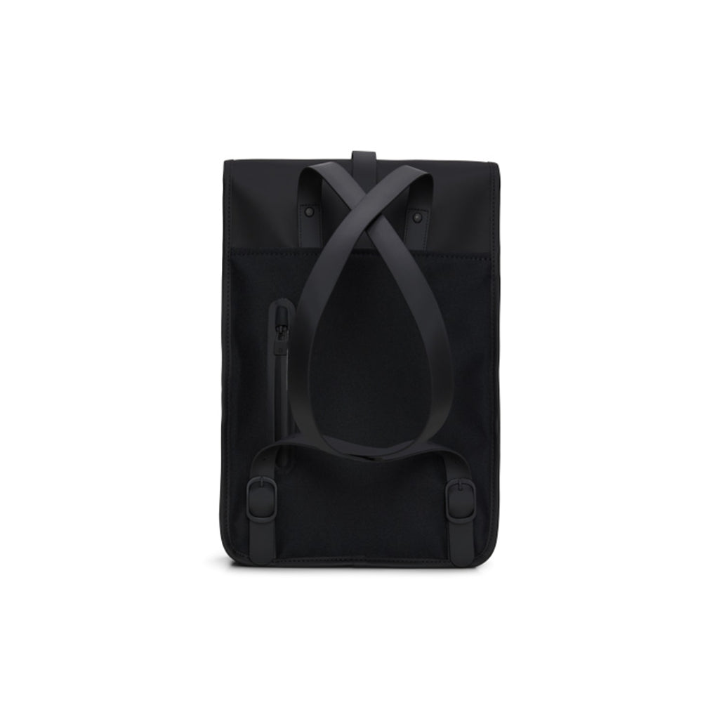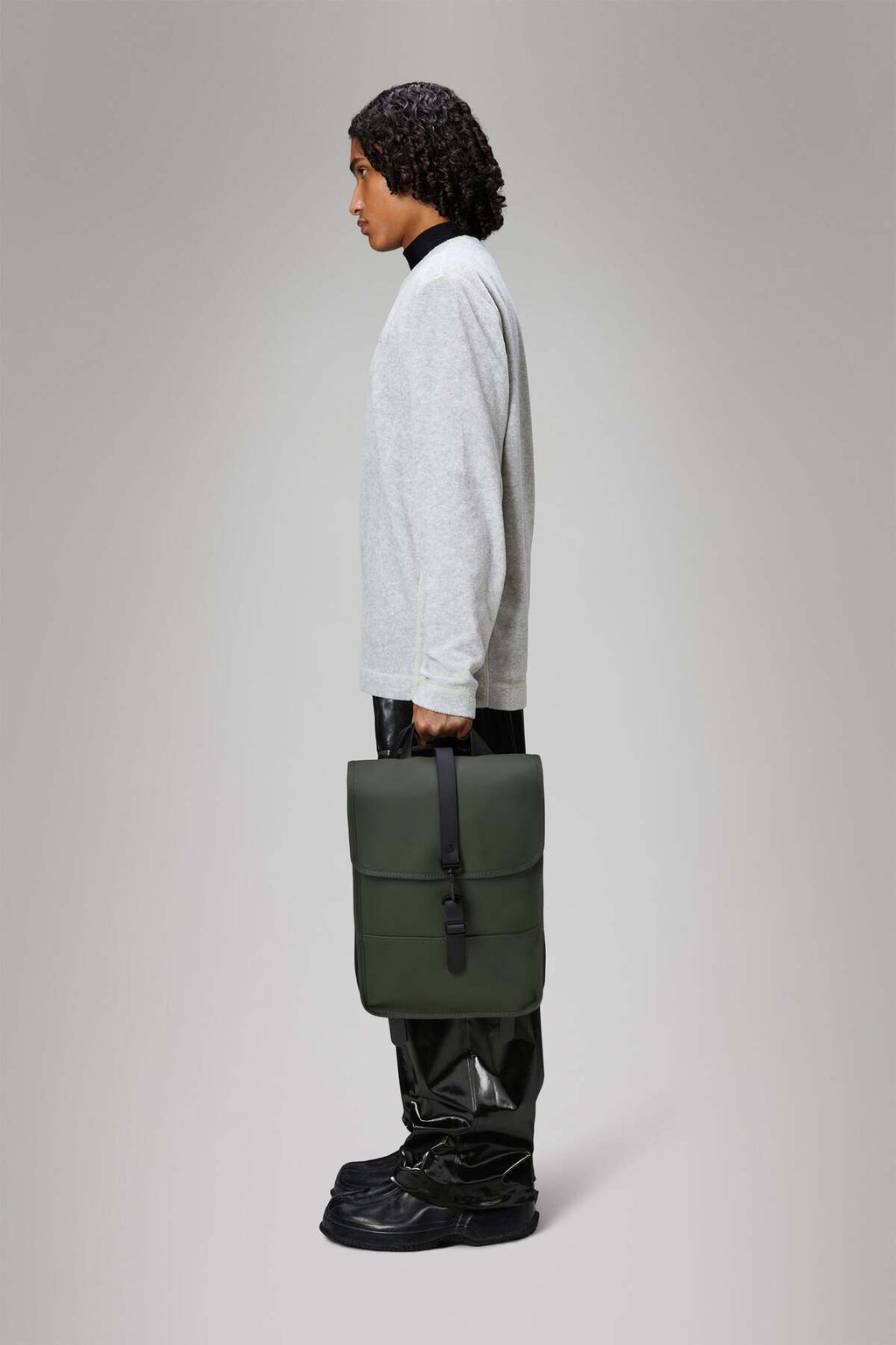 Rains Backpack Mini is a downscaled version of Backpack, a true Rains classic. The silhouette is characterized by its prominent flap and central strap with carabiner closure. This clean and ever-contemporary waterproof rucksack features an internal laptop pocket, a main compartment, and a concealed external phone pocket on the back panel. Backpack Mini is cut in Rains signature waterproof PU fabric, engineered for carrying strength, durability, and a smooth feel.