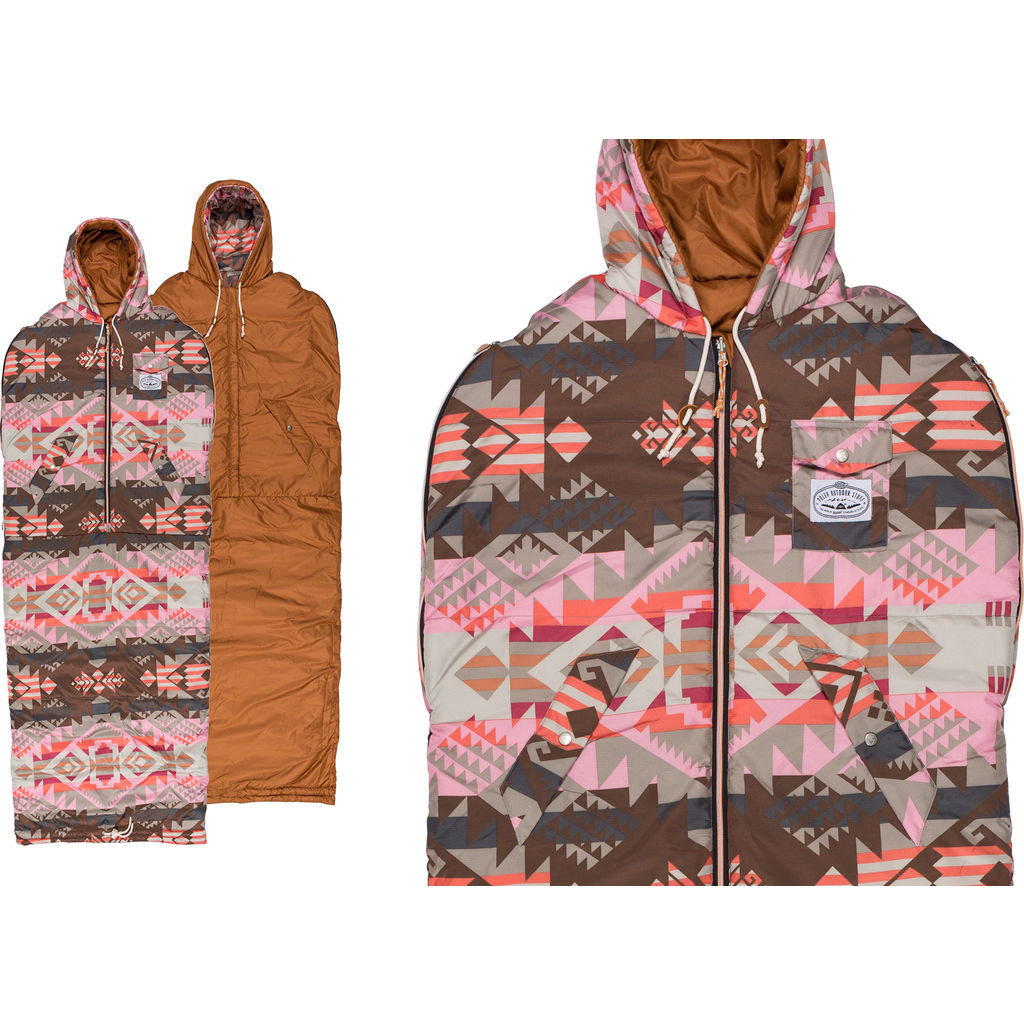Stay warm no matter how far you are from your tent or campfire. The Poler Napsack is a sleeping bag and puffy jacket combined into one cozy coat. With zippers at the shoulder for your arms and a cinched bottom that you can open up for you legs, you never have to get out of your sleeping bag again. Perfect for summer trips, couch surfing, music festivals, or jumping into after surfing. This limited edition of the Napsack is a collaboration with American Wool Mill Pendleton. This synergy of American style and craft has lead to a truly striking design that reimagines traditional southwestern aesthetics with vibrant pinks and warm ambers.