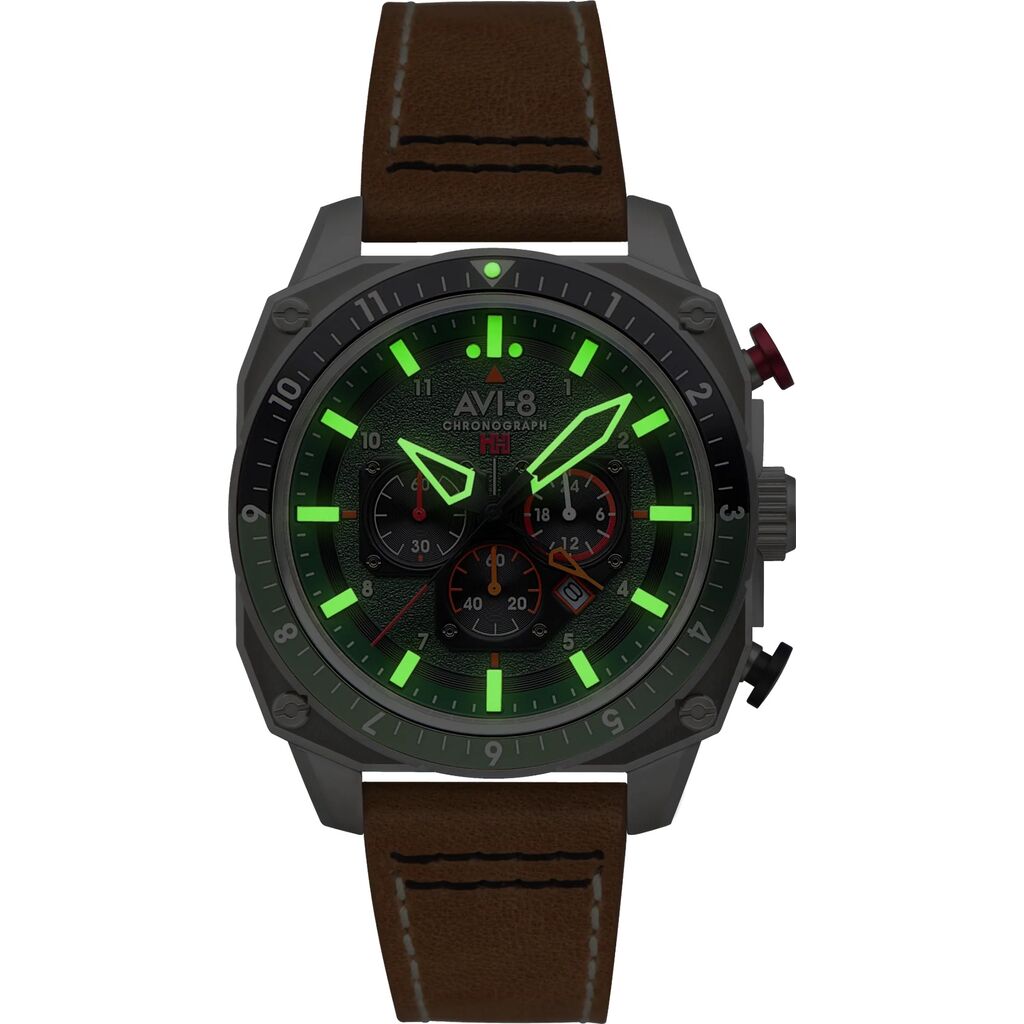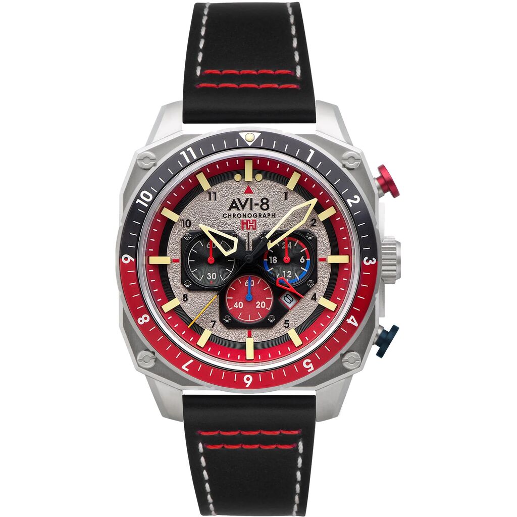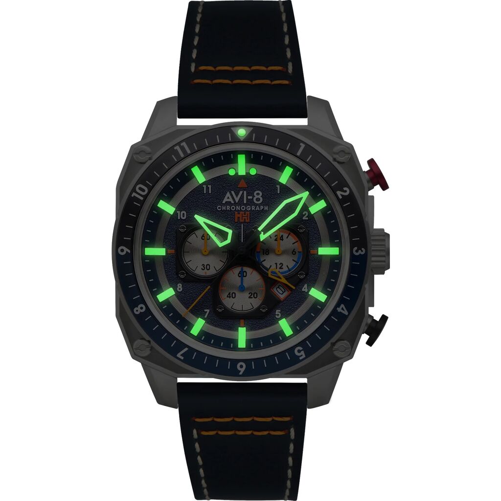 Elevate your style and timekeeping with the AVI-8 Hawker Hunter Atlas Dual Time Chronograph. This watch boasts a Japanese Quartz Chronograph movement, delivering split-time accuracy and dual time zone functionality for the modern traveler. Its 43-millimeter stainless steel case exudes durability, while the anti-reflective coated mineral lens ensures clear visibility. The genuine leather strap adds sophistication to your wrist, and with a water resistance rating of 5 atm, it's suitable for various activities. Weighing just 140 grams, this meticulously engineered timepiece perfectly balances form and function, allowing you to embrace the spirit of a pioneering jet-age aircraft with every wear.