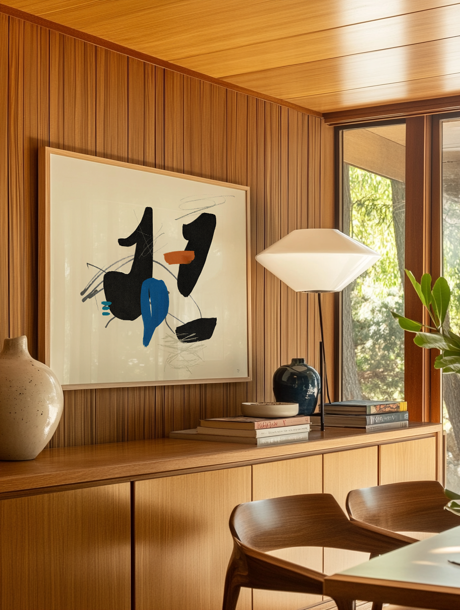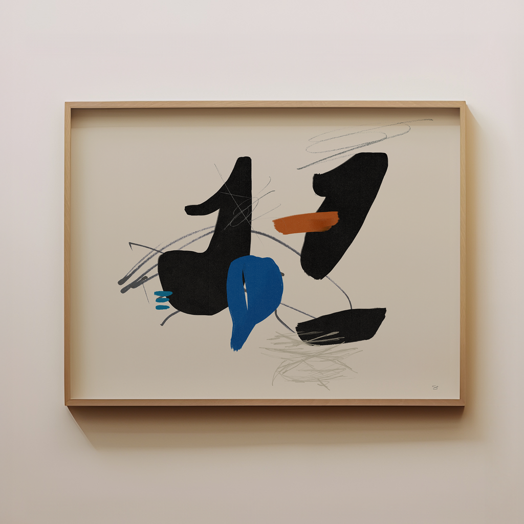 A bold Japandi-style print with black, blue, and terracotta brushstrokes. Minimalist meets expressive design for a sleek, contemporary accent.