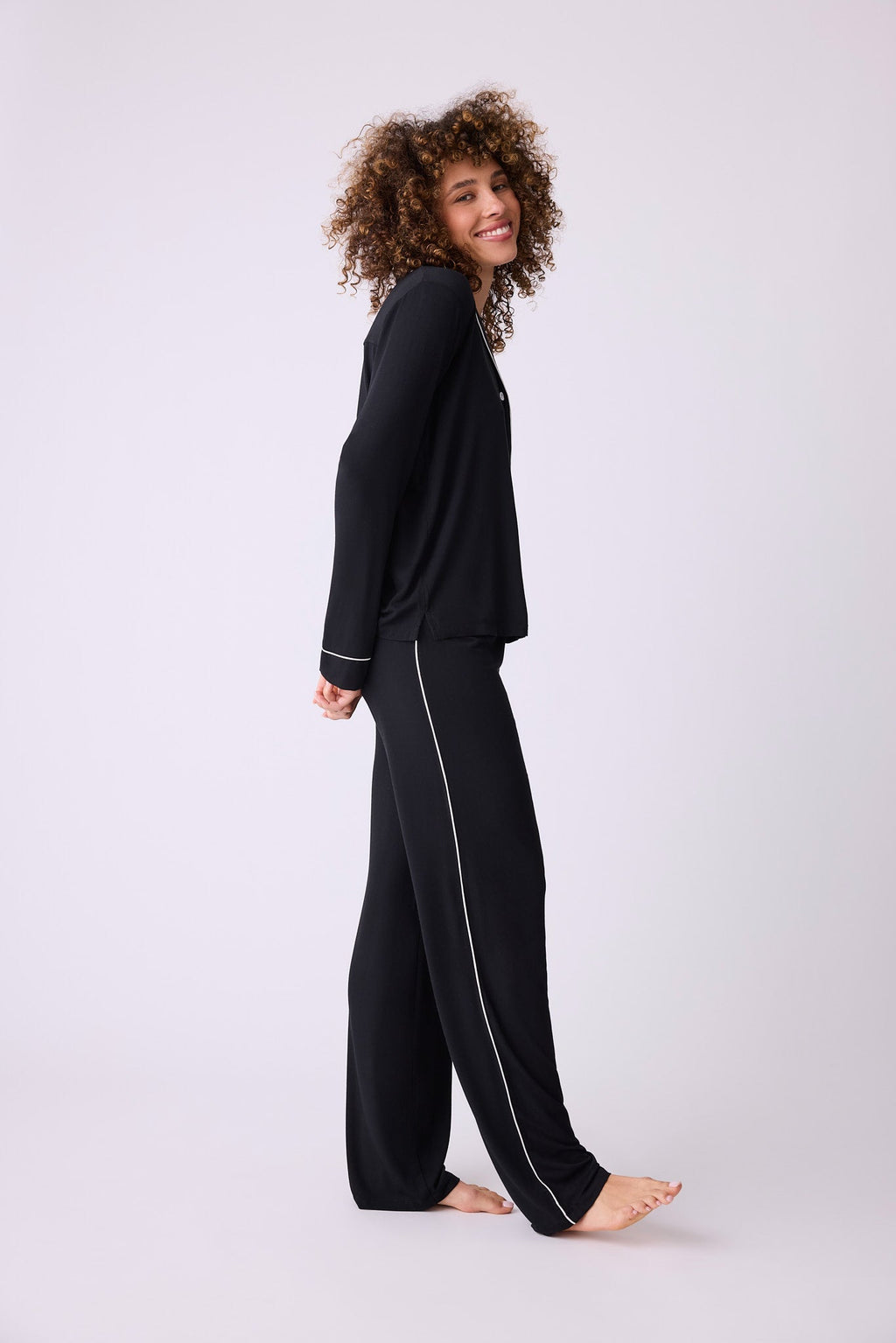 Indulge in timeless elegance with our classic pajama set in black modal. Featuring ivory piping, a button-front collared top, and straight-leg tie-waist pant, it's completed with an embroidered eye mask for 'Beauty Sleep'.