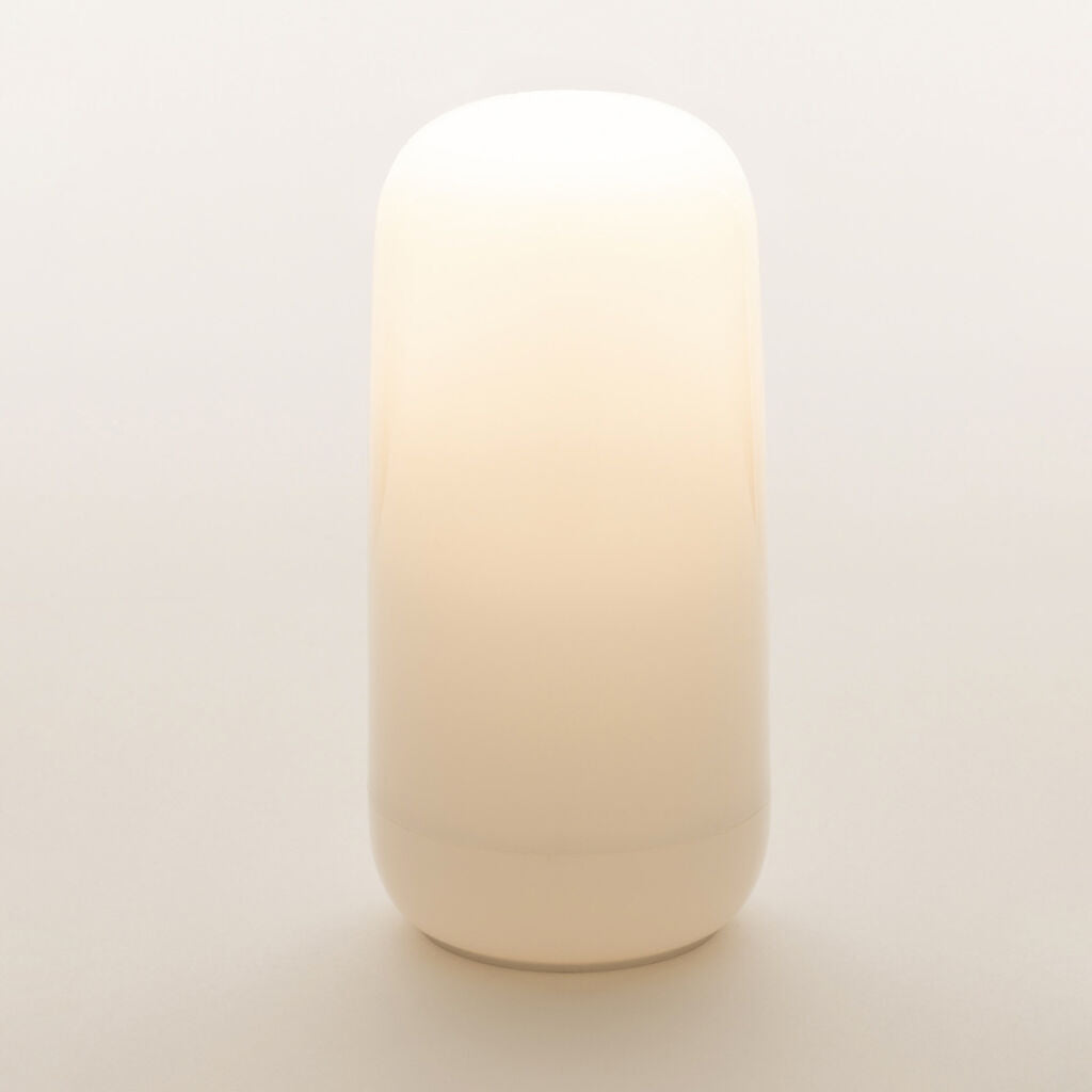 The Gople family keeps growing with new versions dedicated to different lighting design languages. It now becomes a portable lamp that offers an impressive 26-hours of running time without mains electricity. Gople’s characteristic diffuser is made of plastic in order to withstand use across a wide spectrum of spaces and situations. The lamp features the same soft gradient finish as the blown glass original. Inside it allows just a glimpse of the hi-tech LED light source which also houses the rechargeable battery. Minimalist and simple in its elegant shape it becomes an ideal flexible element for lighting bars and restaurants where it enables an unconstrained vision for lighting scenarios and ambiances that can change freely in line with organization of spaces of spaces. It has no protection against contact with water but its lightweight and durable design makes it suitable for outdoor use in dry conditions. The soft diffused light emission can be adjusted to 3 different brightness settings to create different ambiances.