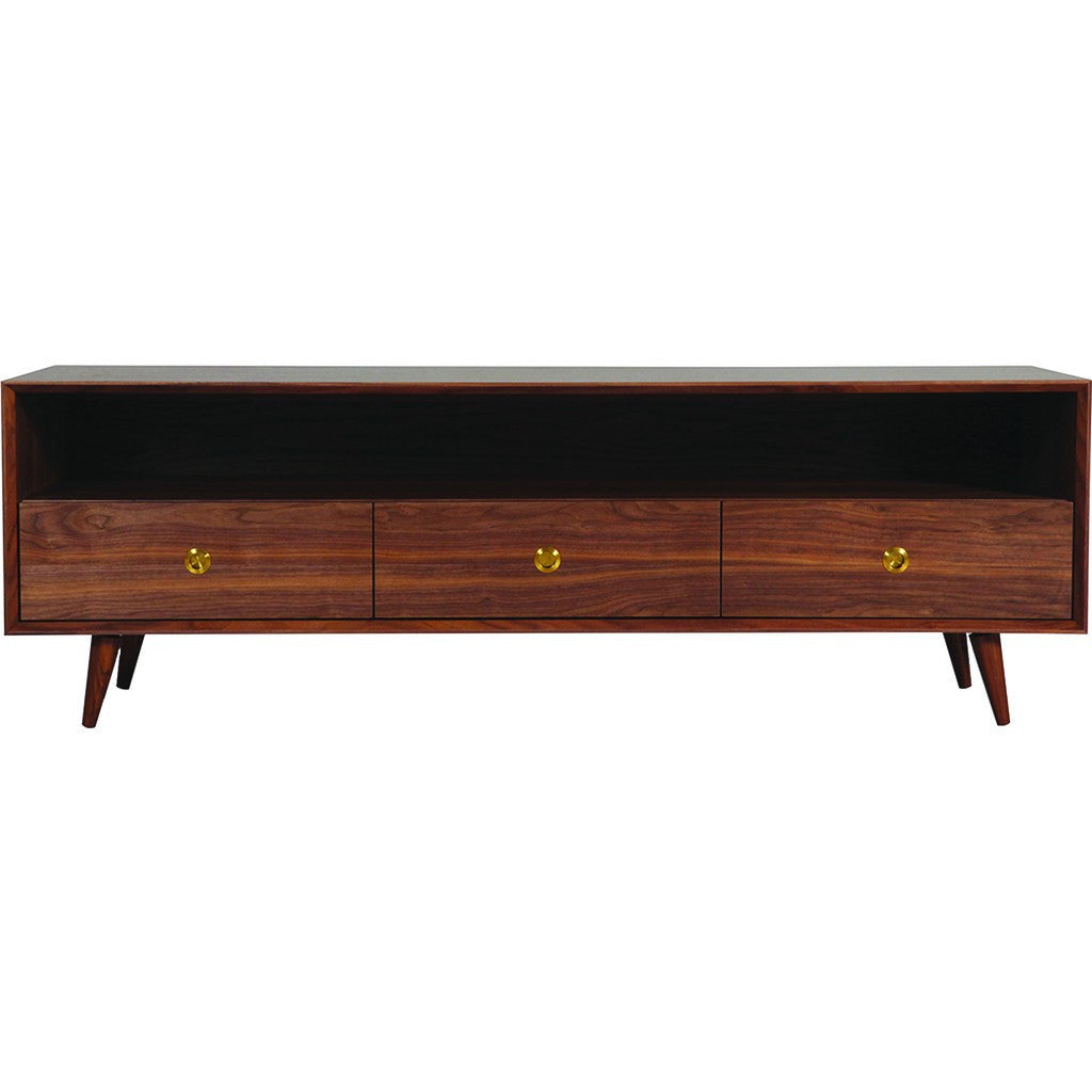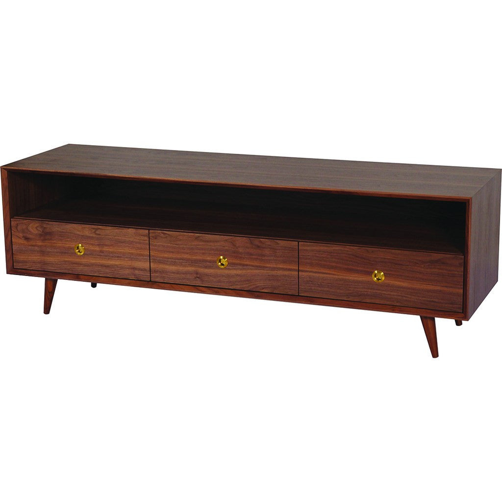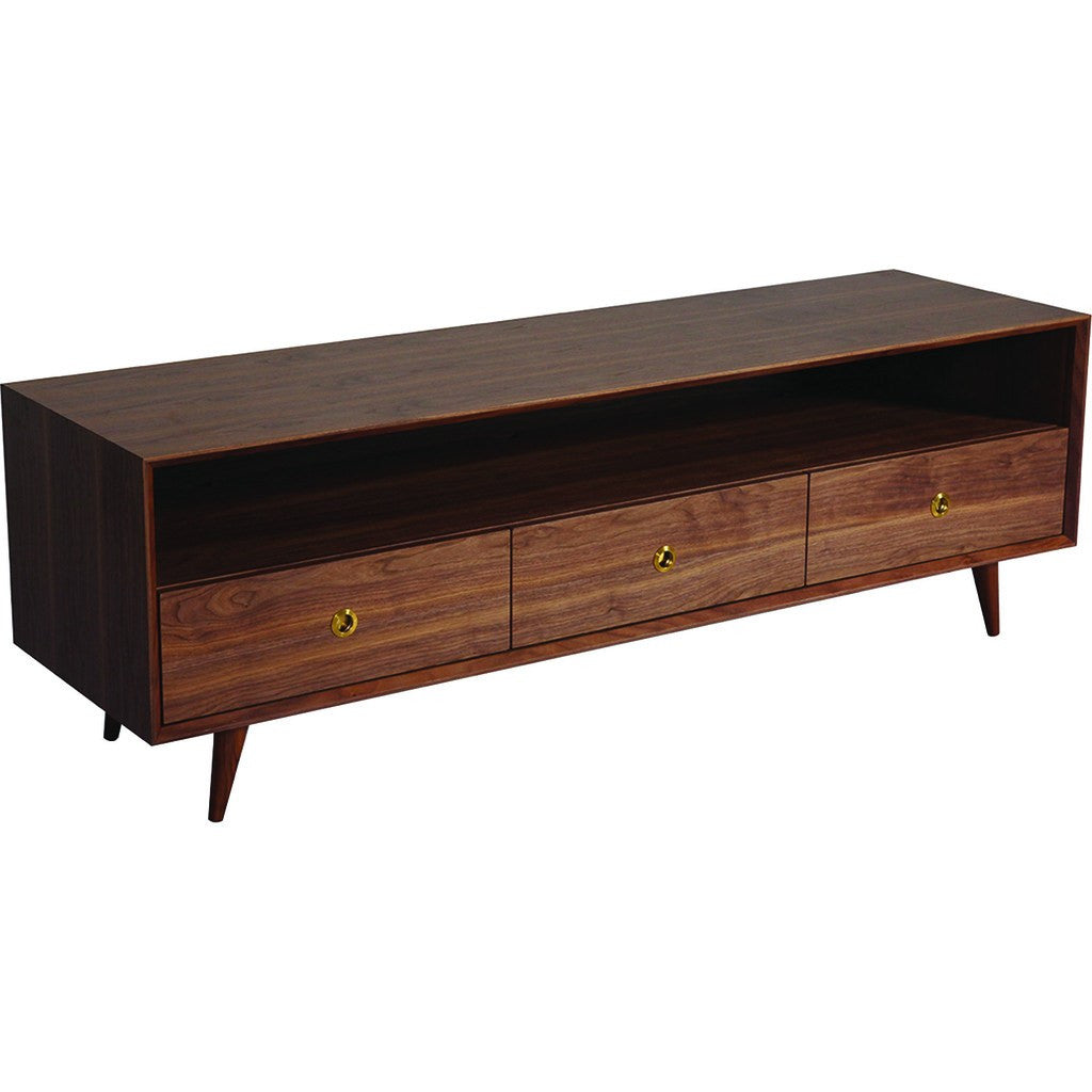 The Vista Media Unit by Ion Design is a classic beauty: the fluid lines and gorgeous grain patterns of American Black Walnut bring this simple, minimalist piece to life. This classy veneer is accentuated by brass handles that bring their own gleam, big enough to be noticeable and to offset the wood. Three cabinets give you room for storing DVDs, discs, headphones, accessories and more, while there is a large central slot for media boxes.