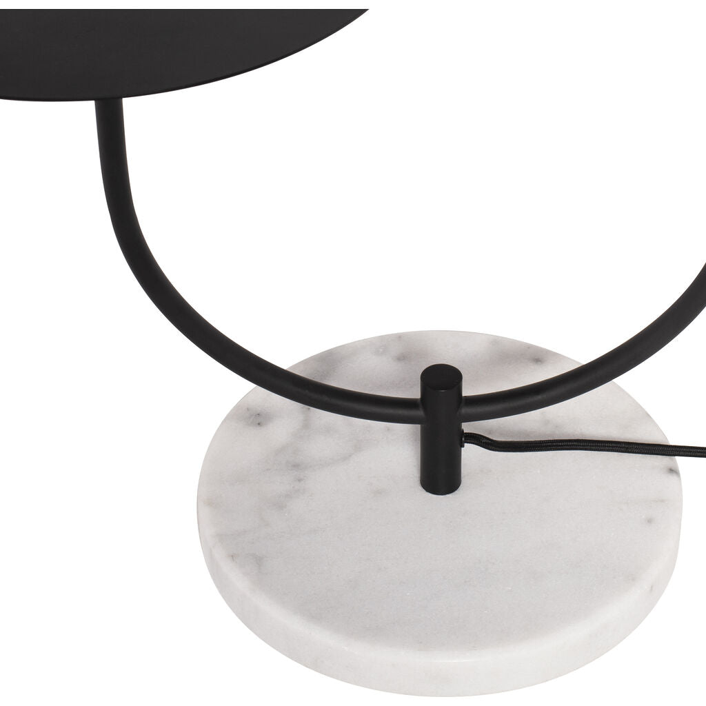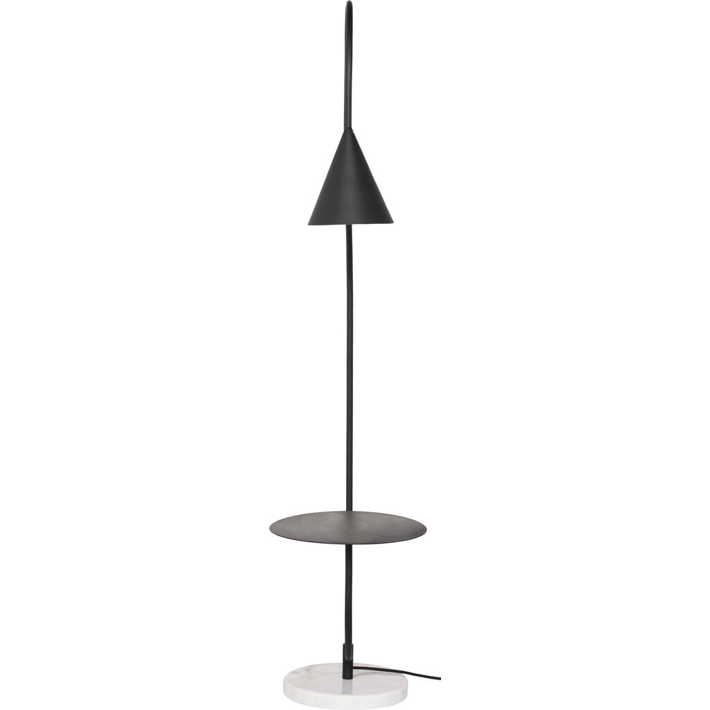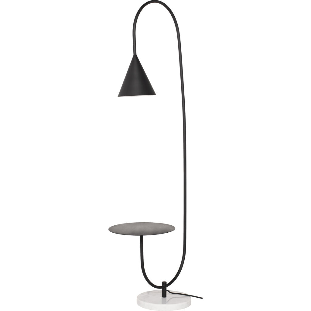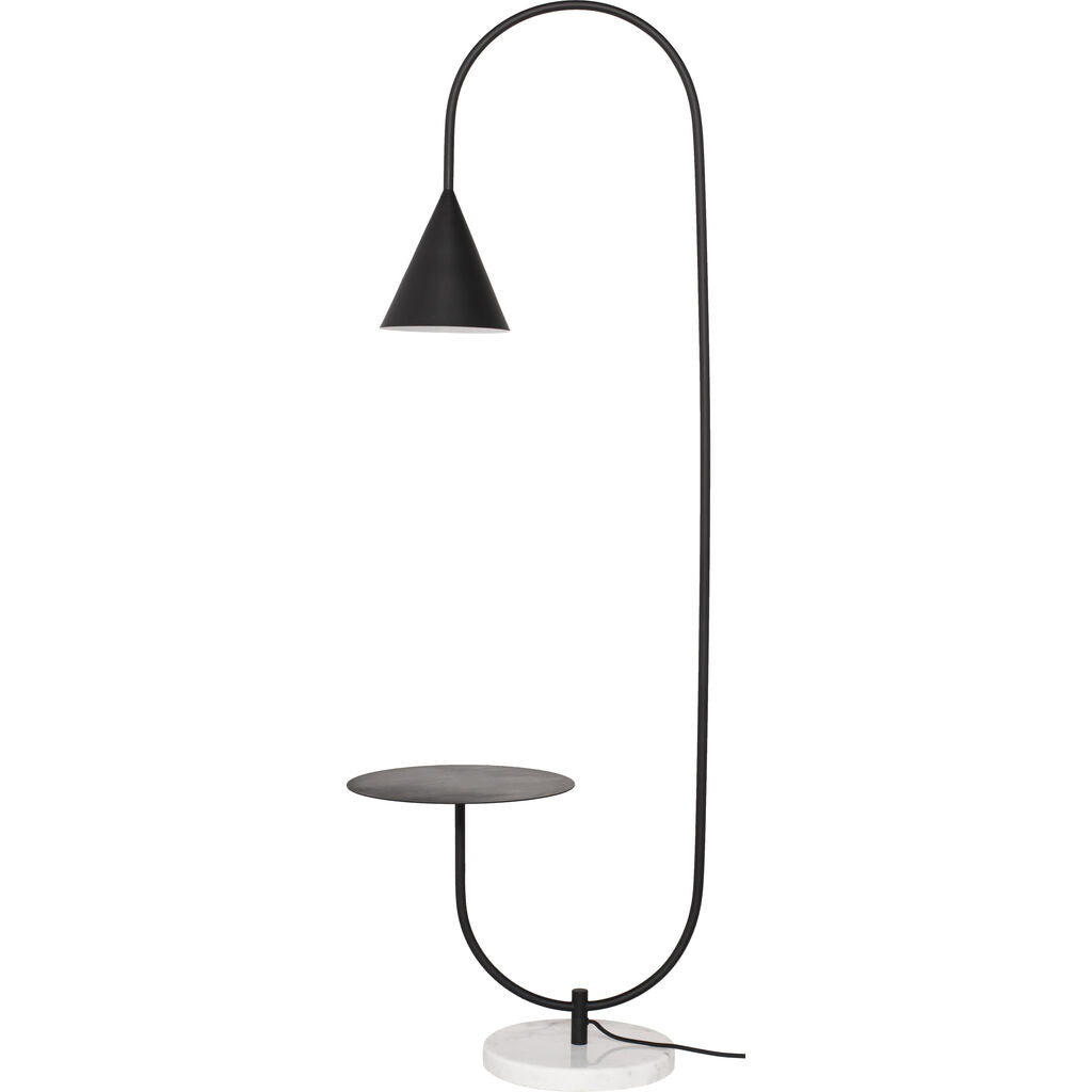 The Arnold floor light is the essence of sculpture as form and function. Set upon a round white marble base the Arnold's brilliantly designed matte black curvilinear frame with peaked shade is at once a floor light and circular side table.
