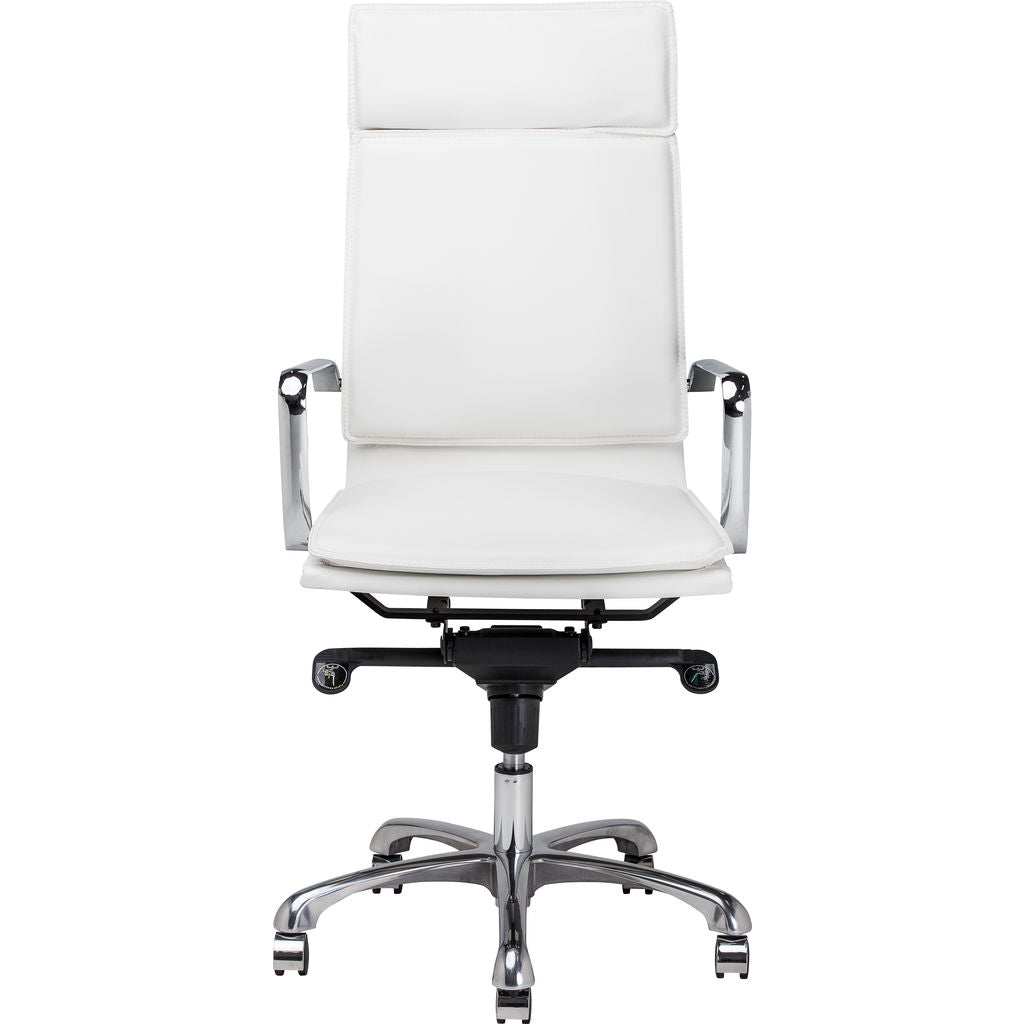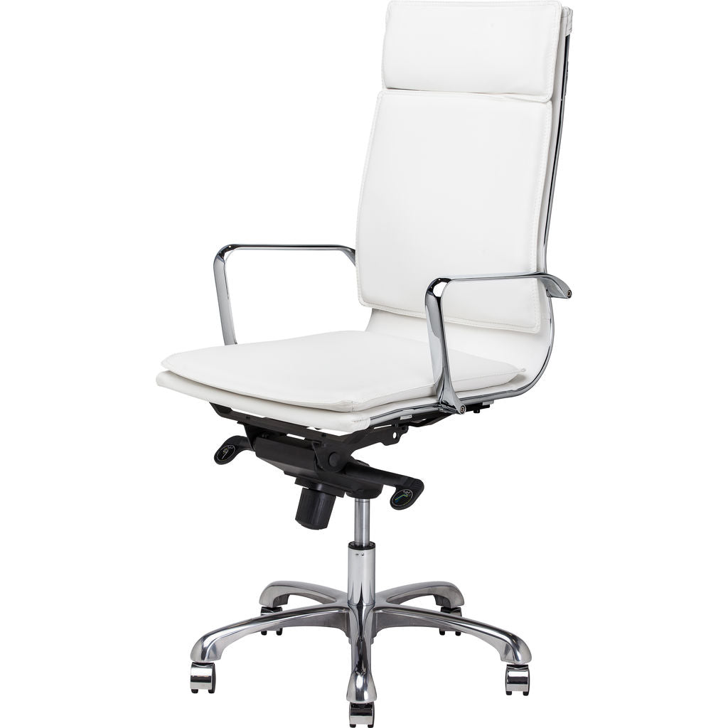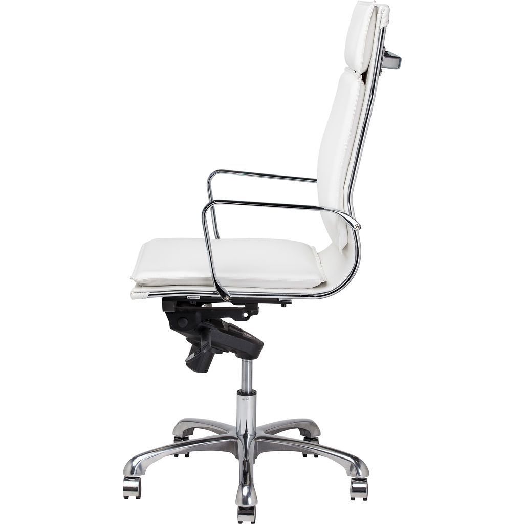Blending contemporary design and premium construction, the Carlo Swivel Chair features a chromed iron frame, chromed aluminum base and matching cap castors. The gas lift has a 2.75" travel; making adjustments seamless, simple and quick. Each Carlo High Back Desk Chair is upholstered in supple white Naugahyde for an attractive look and comfortable feel.