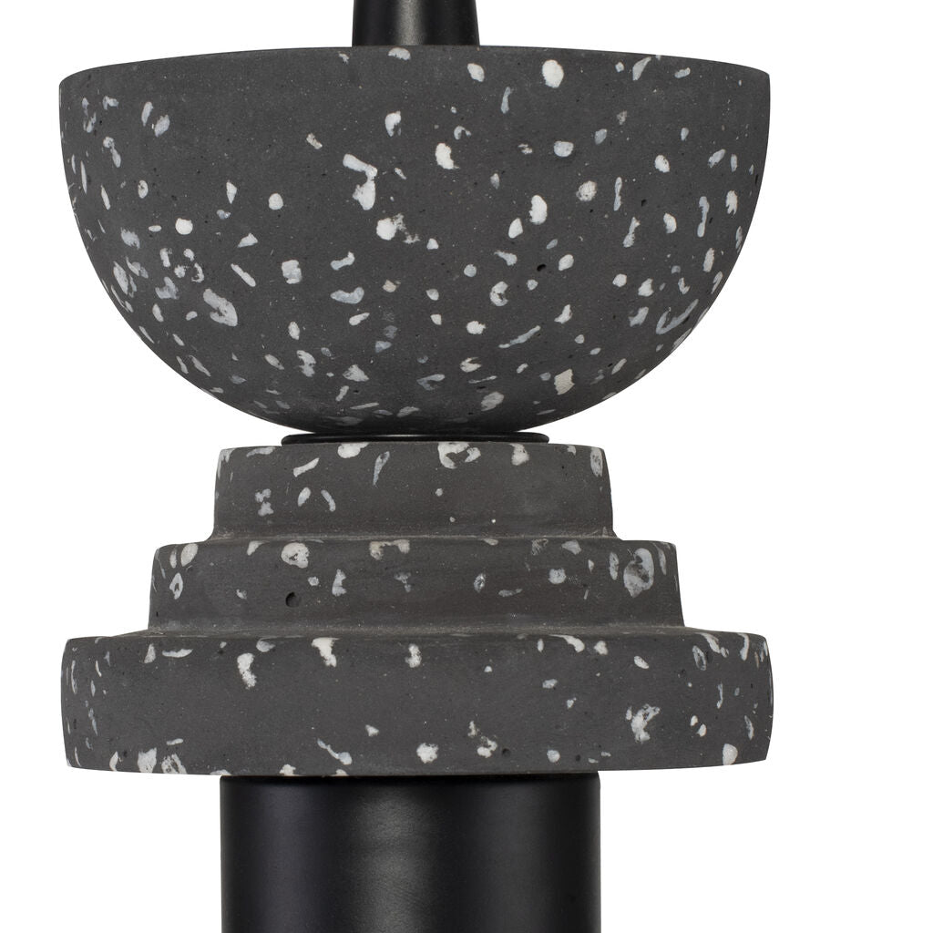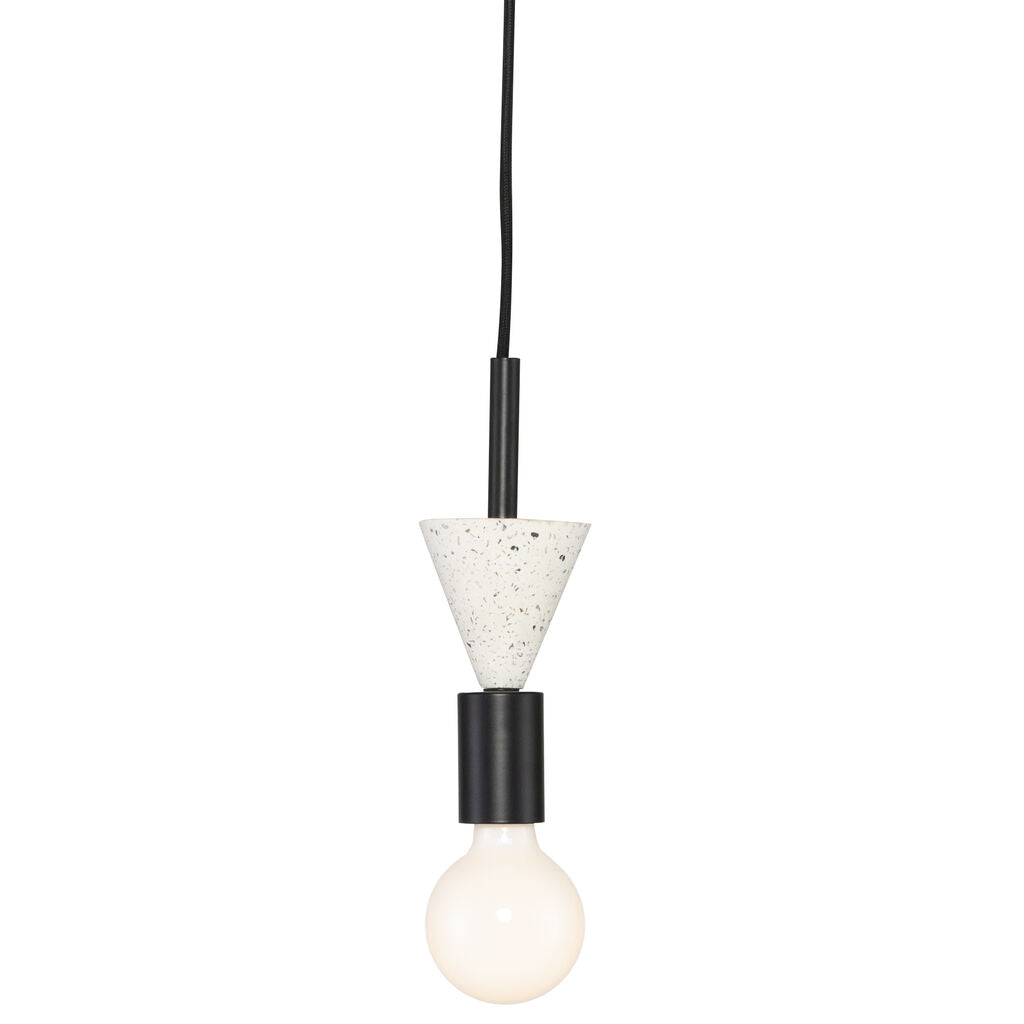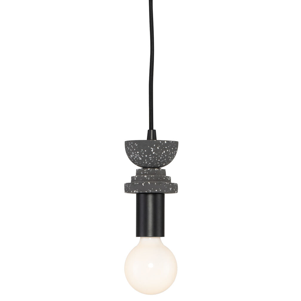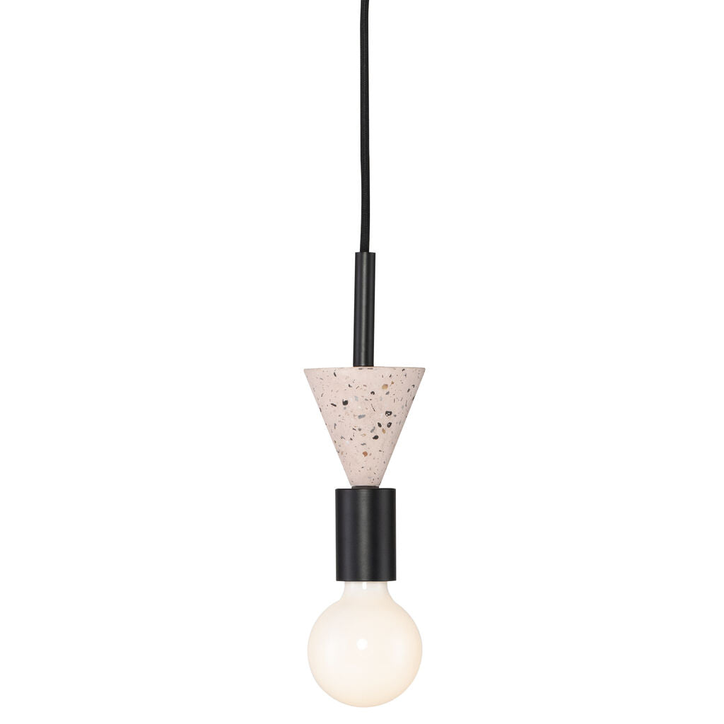 Hanging straight from the ceiling the Dawn pendant is sleek with an artsy edge. Geometric shapes are stacked to form a sculptural linear form. Pair the terrazzo and black metal shapes with a modern glass bulb to bring depth to this unassuming fixture.