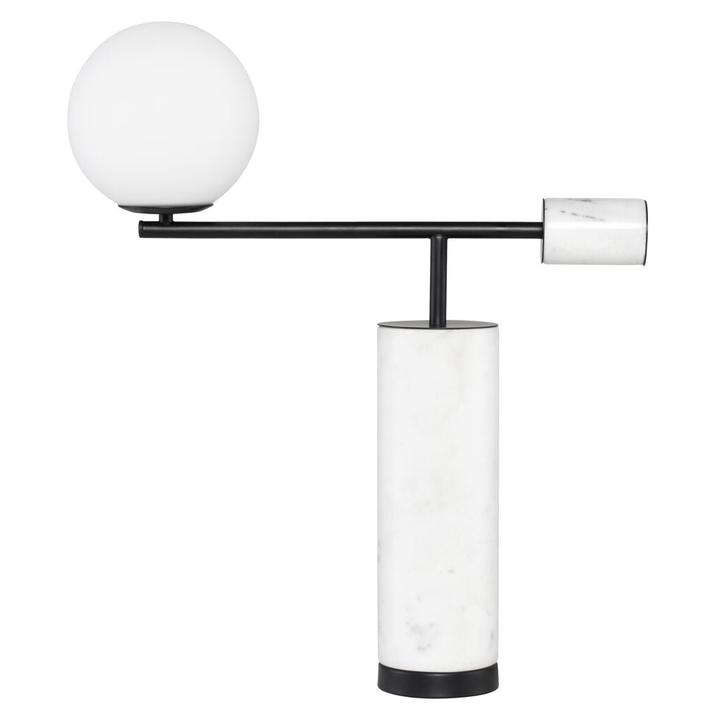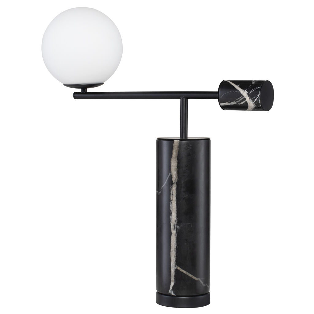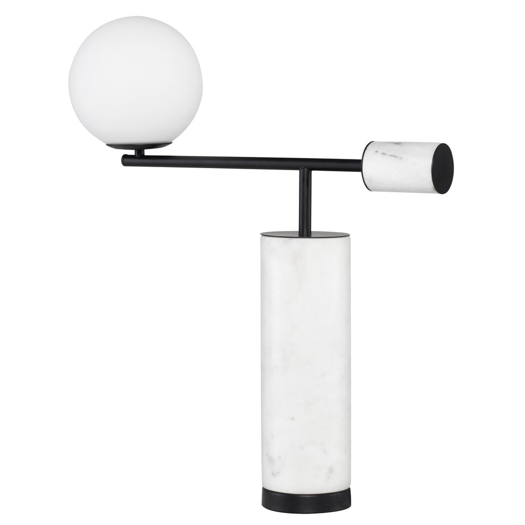 With a modern appeal and the Justine table light strikes a bold silhouette. The smooth cylinder base is echoed by a smaller cylinder detail on one side of a t-shaped matte black stand. On the other side with an elegant white sphere casts a diffused light around your room.
