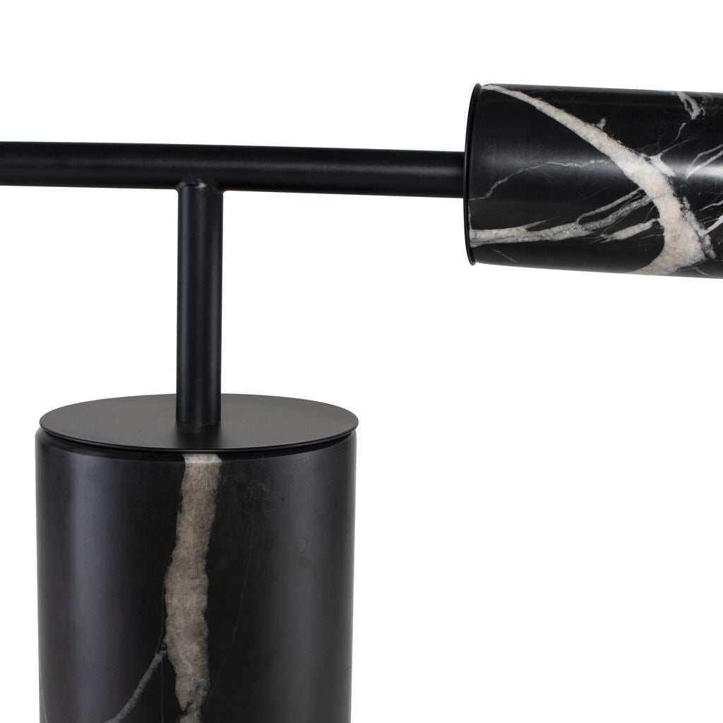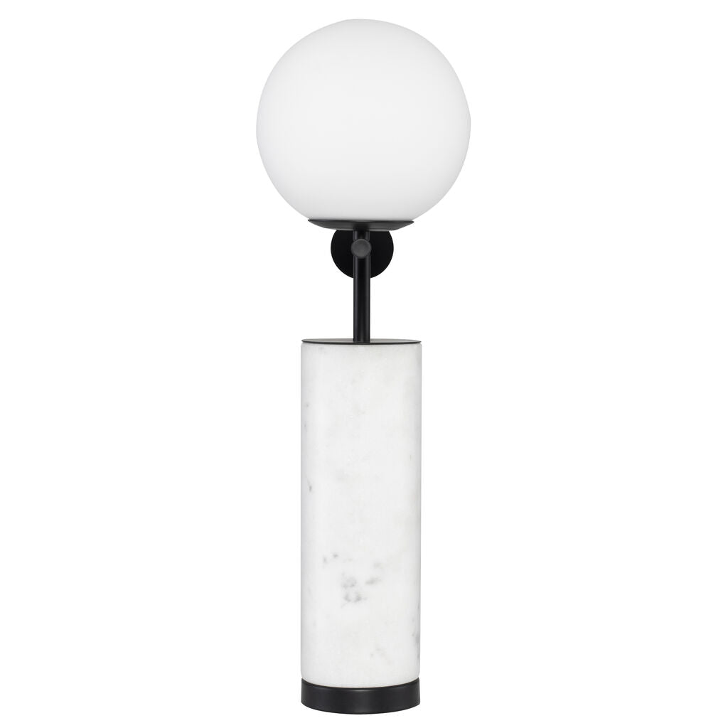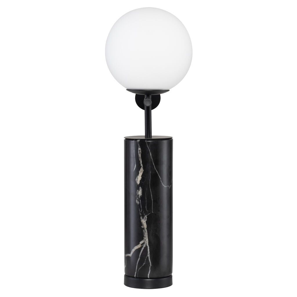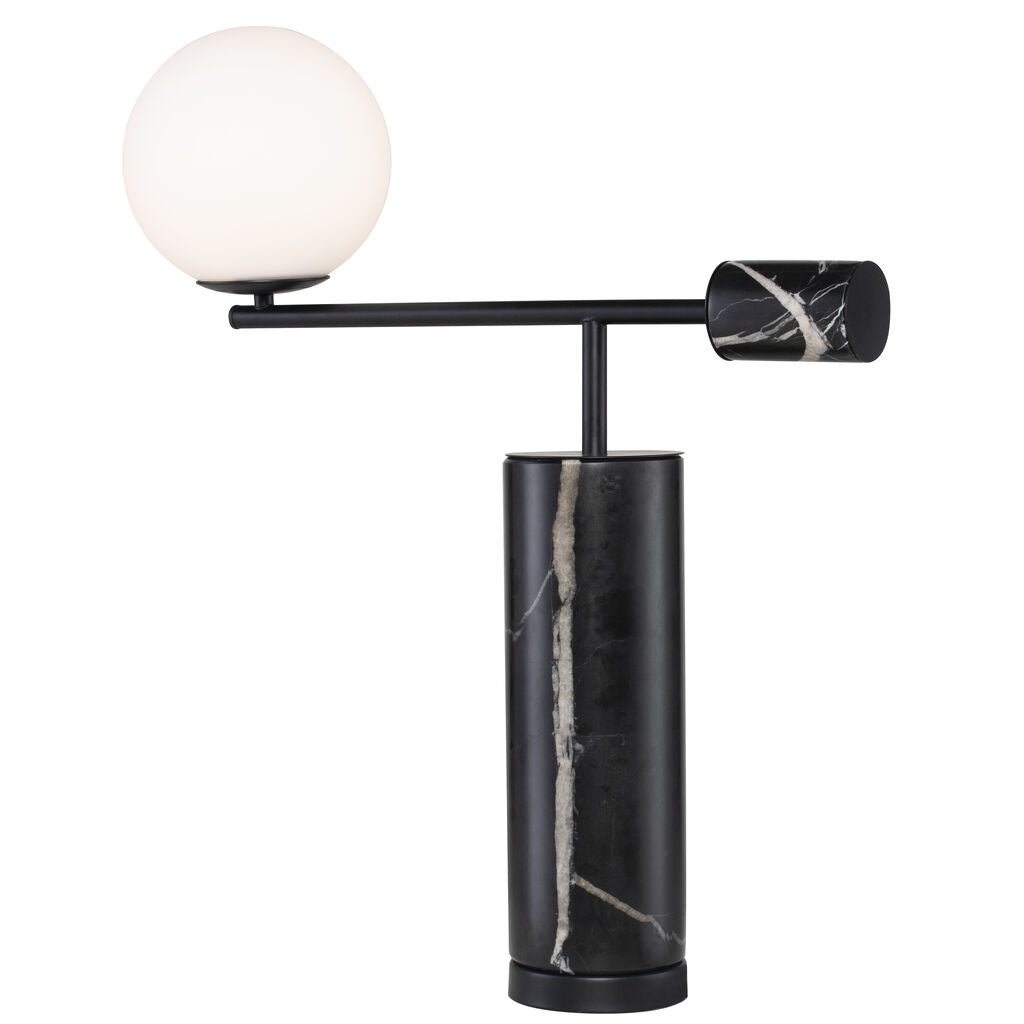 With a modern appeal and the Justine table light strikes a bold silhouette. The smooth cylinder base is echoed by a smaller cylinder detail on one side of a t-shaped matte black stand. On the other side with an elegant white sphere casts a diffused light around your room.
