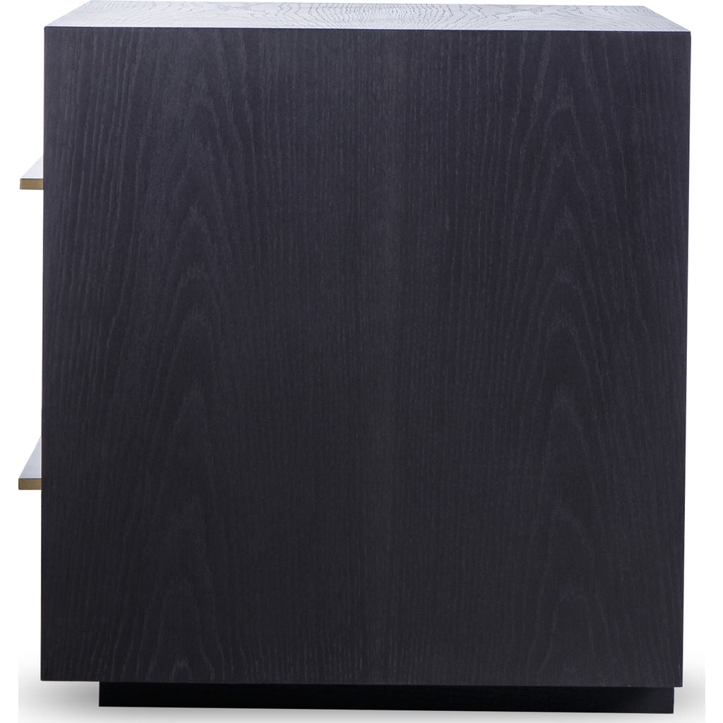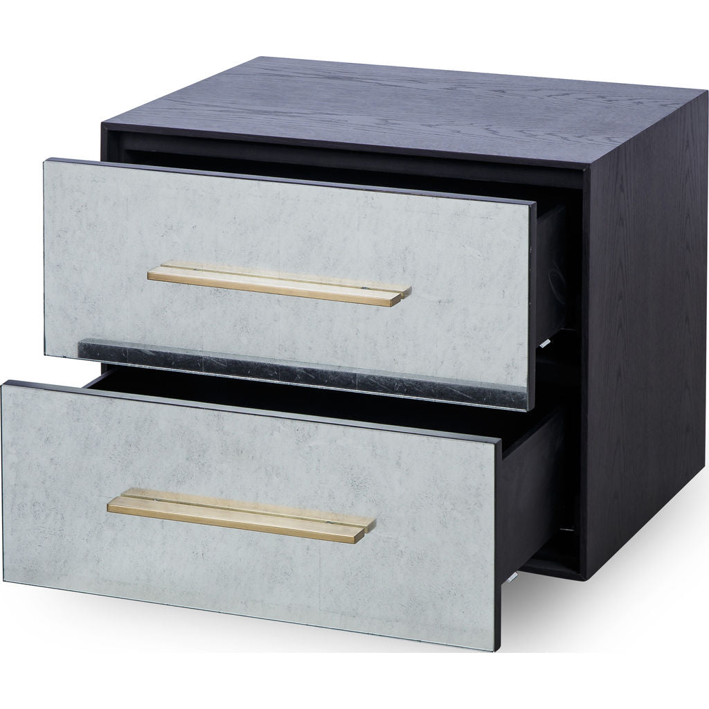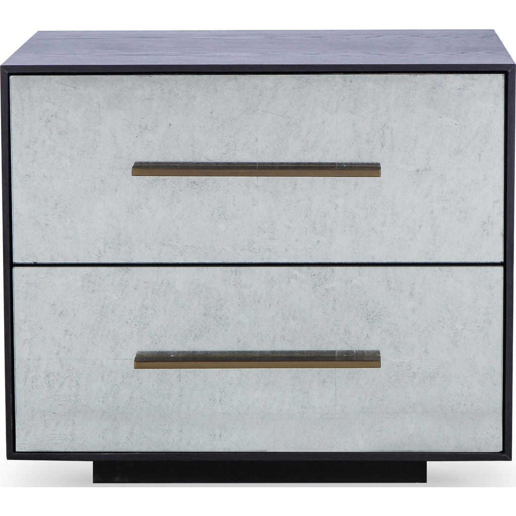 Thomas Bina's Waters 2 Drawer Nightstand is an elegant, clean-lined storage unit wrapped in smoked black oak veneer. Contrasting silver leaf, eglomise drawer fronts add add a surprising synergy to the the color palette of this side table.