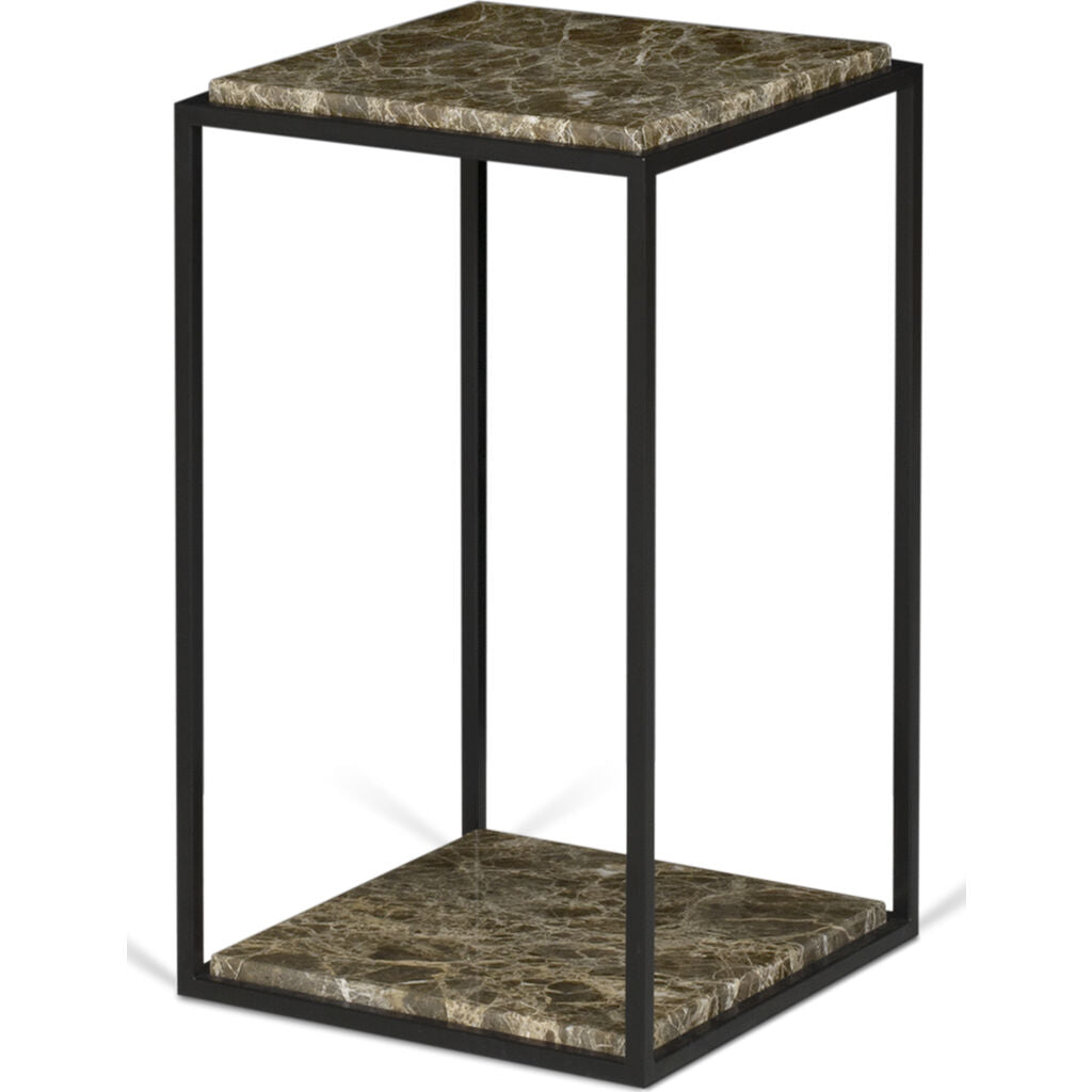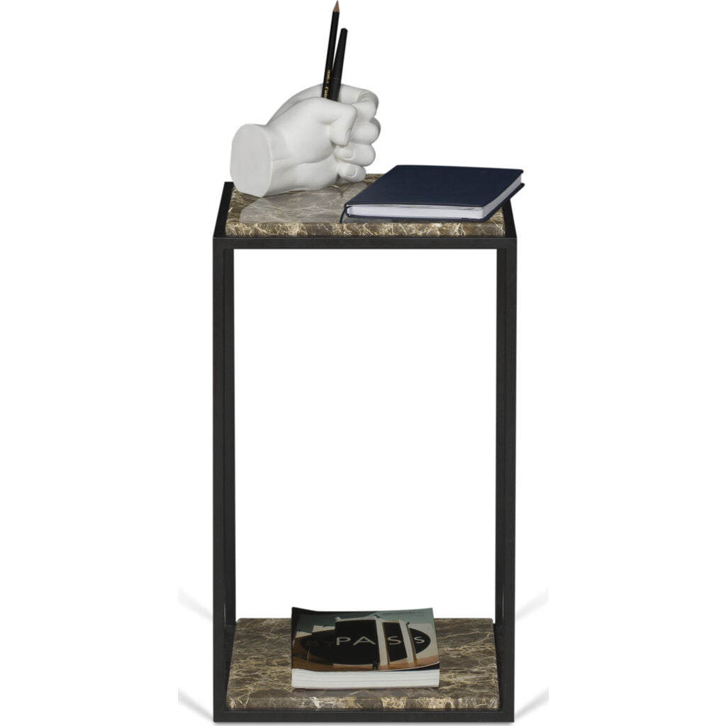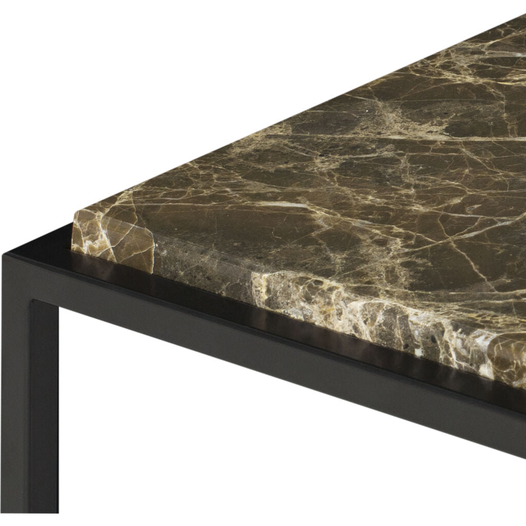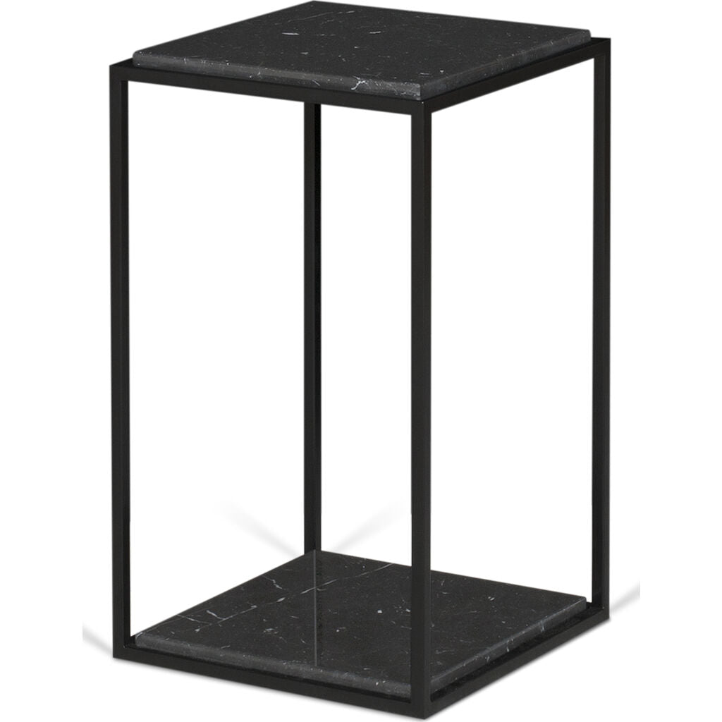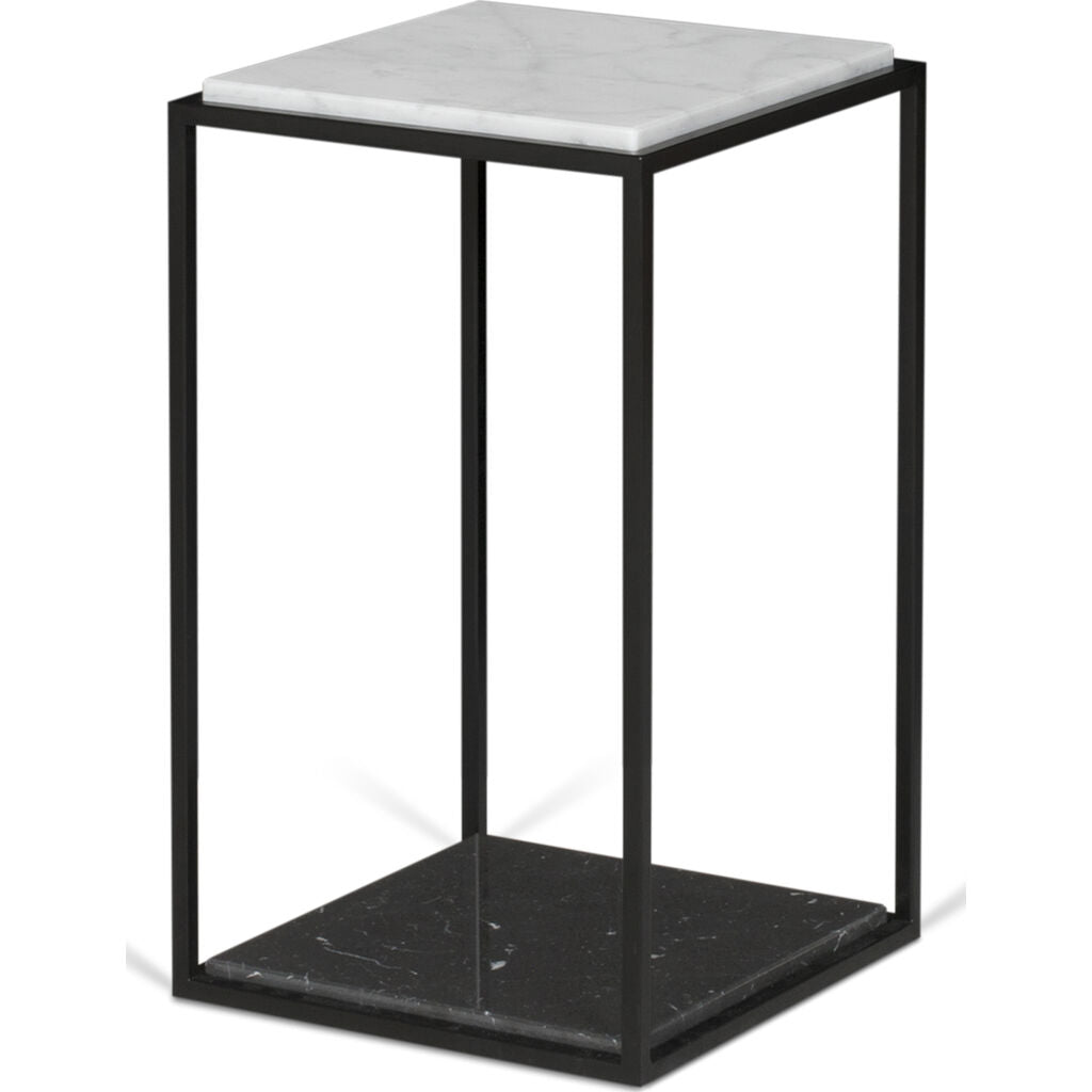 Marble-top side tables with various color options and legs in black lacquered steel. Sophisticated and well-proportioned side tables with two marble surfaces connected by a thin black metallic structure. The tops are available in white, black and brown marble and in a color mix of white for the top and black marble for the bottom.