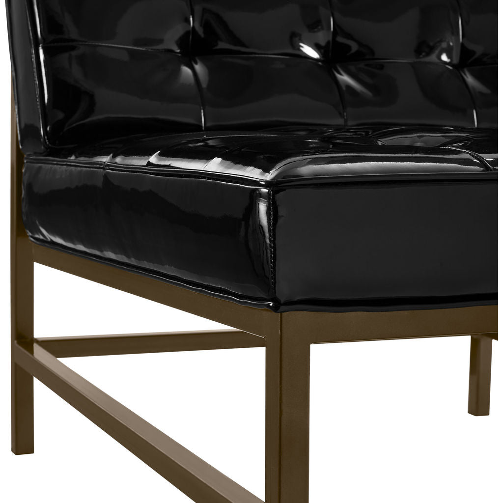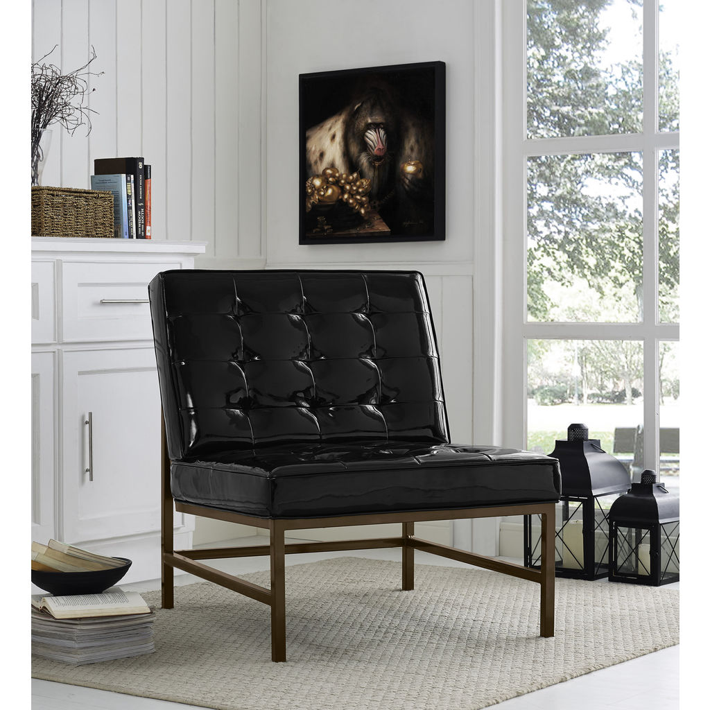 Add a touch of glamour with the TOV Furniture Black Jed Patent Leather Chair. The high gloss finish is sure to make a statement no matter where it ends up. This accent chair has a gold frame and is made of solid iron so it will last for years to come. Comfort meets style with this plush one of a kind chair.