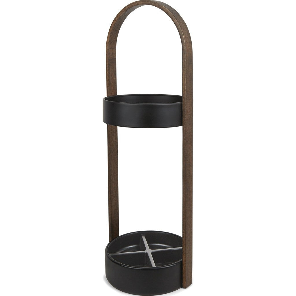 The Hub Umbrella Stand in black and walnut features a modern design to help organize and store your umbrellas. With a base that collects excess water and two hooks for storage, this stand will complement any casual entryway, keeping your home dry and organized.