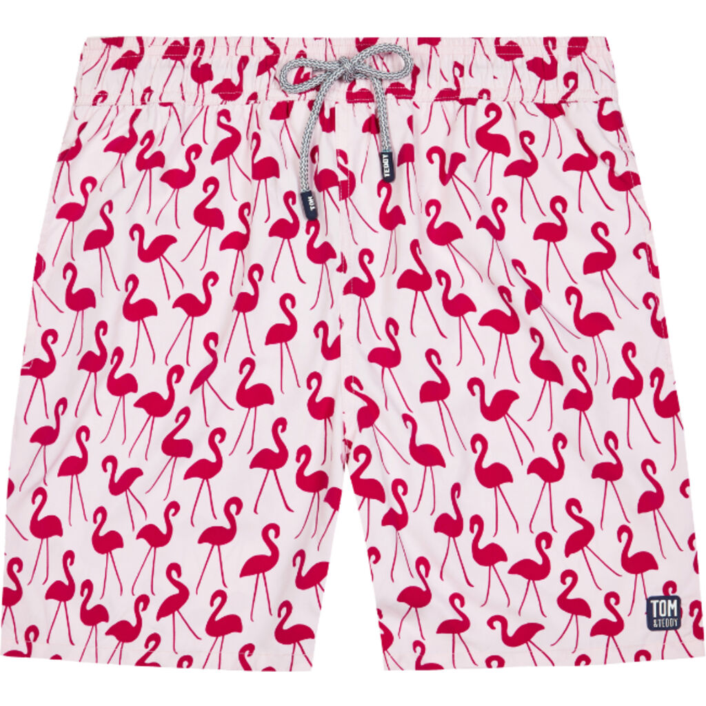Classic style swim trunks featuring a bold flamingo print in contemporary shades of pink with red. Available men for boys.