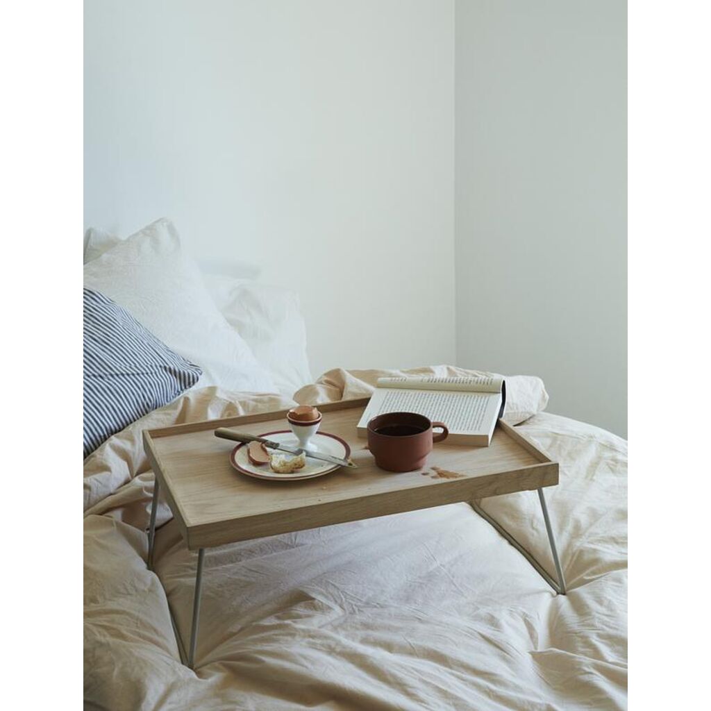 Serve a proper breakfast in bed or a cup of coffee on the balcony. Nomad Table Tray in oak has folding legs, which makes it easy to place on top of pillows, blankets, and other soft surfaces.