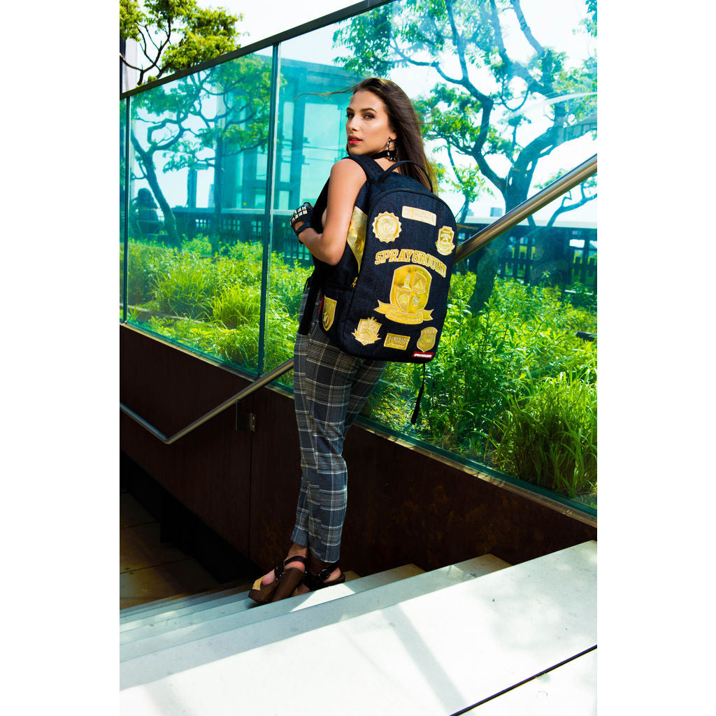 Look good and make a statement with the Sprayground Ivy League Backpack. Featuring gold patches on a denim print backpack. A great pack for whatever you need, boasting separate laptop and tablet compartments, zippered front and side pockets, and an organizer pocket to keep you organized and prepared. With ergonomic mesh back padding and adjustable straps, it's comfortable to wear all day long.