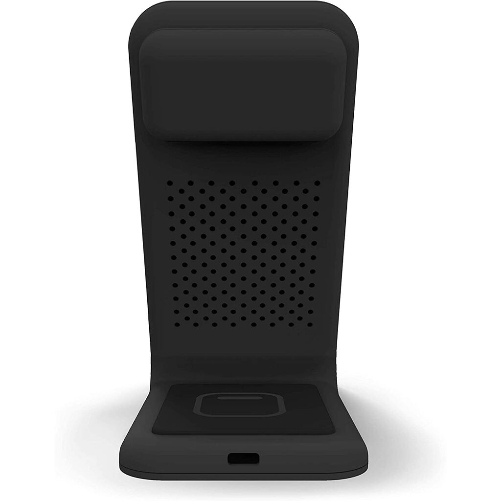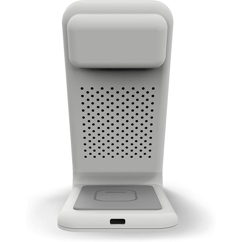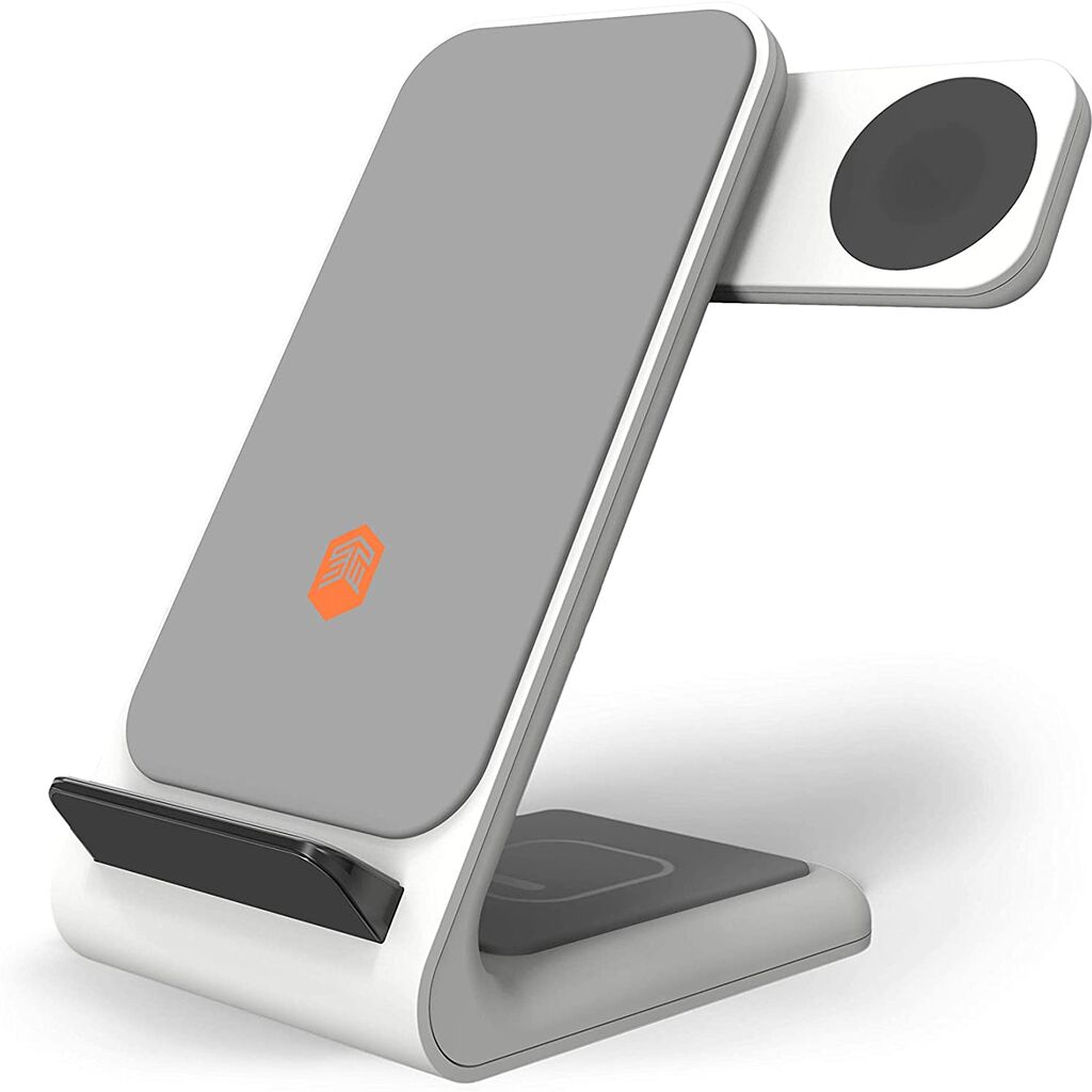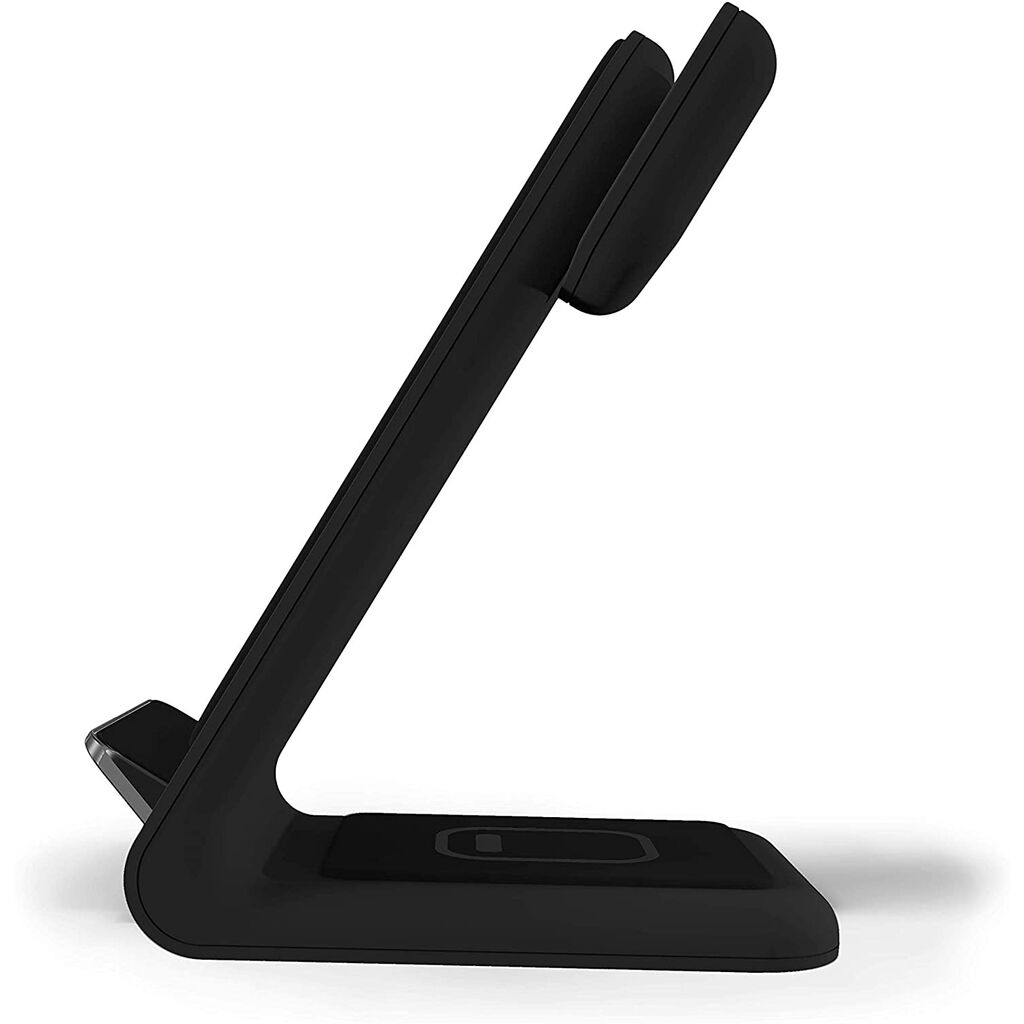 A wireless charging stand that rejuvenates three devices at once. Slim and sleek, with a small footprint that takes up minimal space on a desk or nightstand.