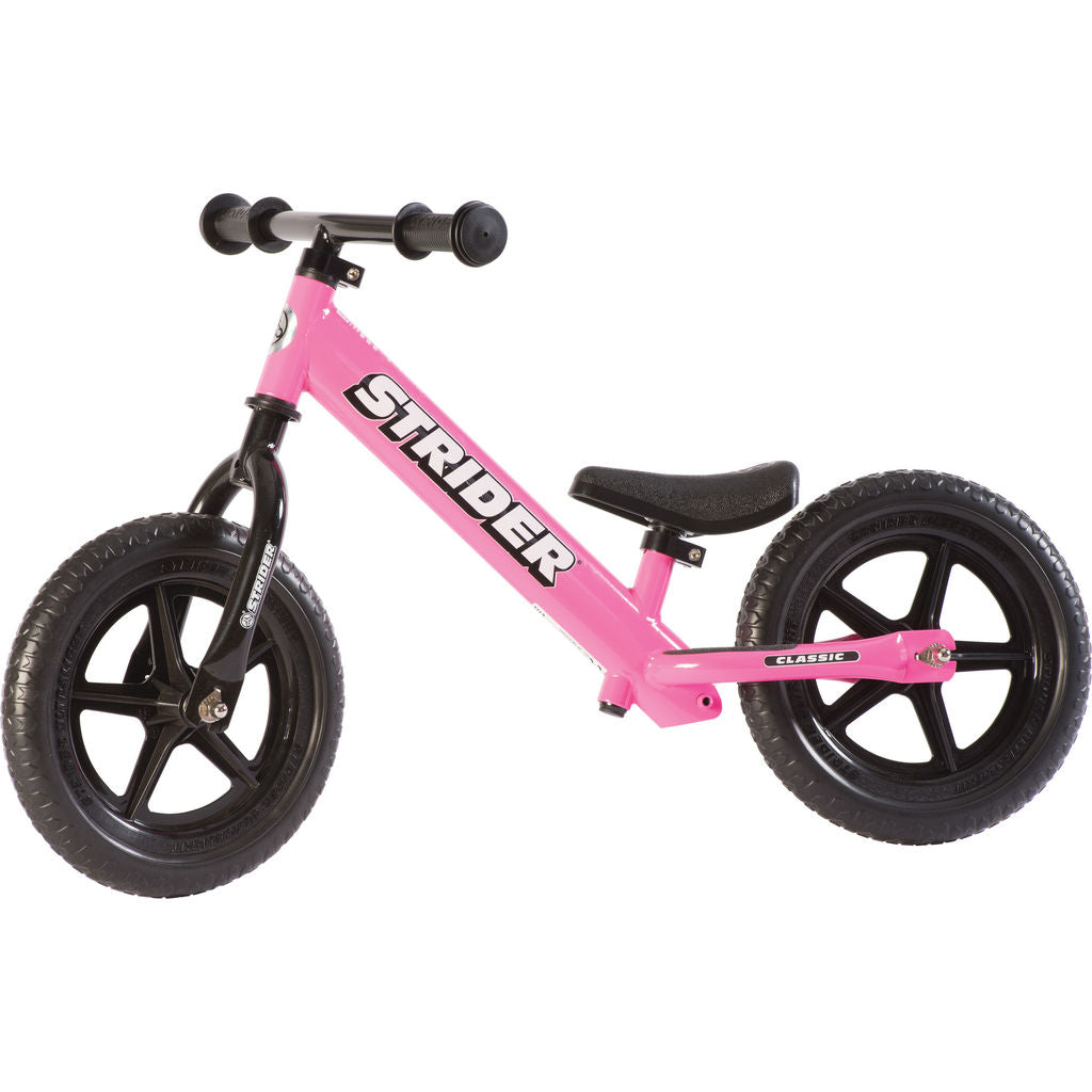 Crafted for children ages 1-3, the Strider Classic Toddler Balance Bike is a fun and easy way to introduce your little one to the exhilarating world of cycling. The Strider Classic is propelled solely by walking/running, allowing your child to master the fundamentals of riding in a fun, safe manner. This little pink balance cycle has a 12" inseam, so most toddlers can safely rest they're feet on the ground while seated.