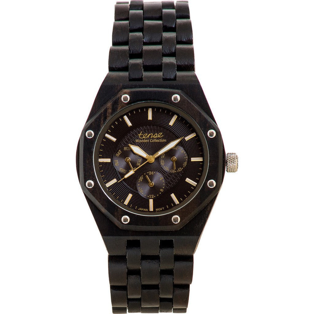Part of the Adventure Collection, the Tense Washington Watch is made with natural Dark Sandalwood. The octagonal design on the watch face is finished with bezel studs. This time piece features a calendar date, 24 hours, days of the week indication, and luminescent hands. The Dark Sandalwood is fixed with a premium stainless-steel crown and automatic push-button clasp. The wooden bracelet is hypo-allergenic and adjustable to fit any wrist.