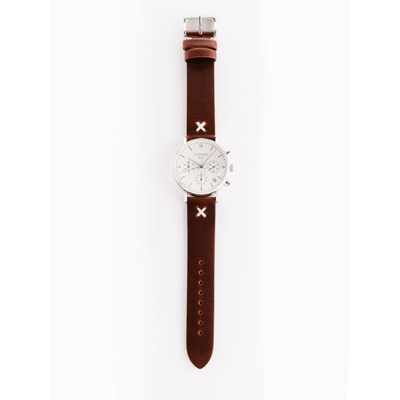 Throne launched their watch brand with unprecedented success, giving them the chance to fine tune their signature 1.0 model with this 2.0 model on a classic chronograph watch. Crafted in Brooklyn, New York the domed crystal adds exceptional depth to the subtle styling, protecting the ultra reliable swiss movement, and signature '13' at midnight. The Masses 2.0 Watch delivers a clean aesthetic with the white and silver colors on a classic brown leather band. Along with high quality materials, will surely last for many generations. With each watch individually numbered, you can be assured to add a truly timeless piece to your accessory repertoire.