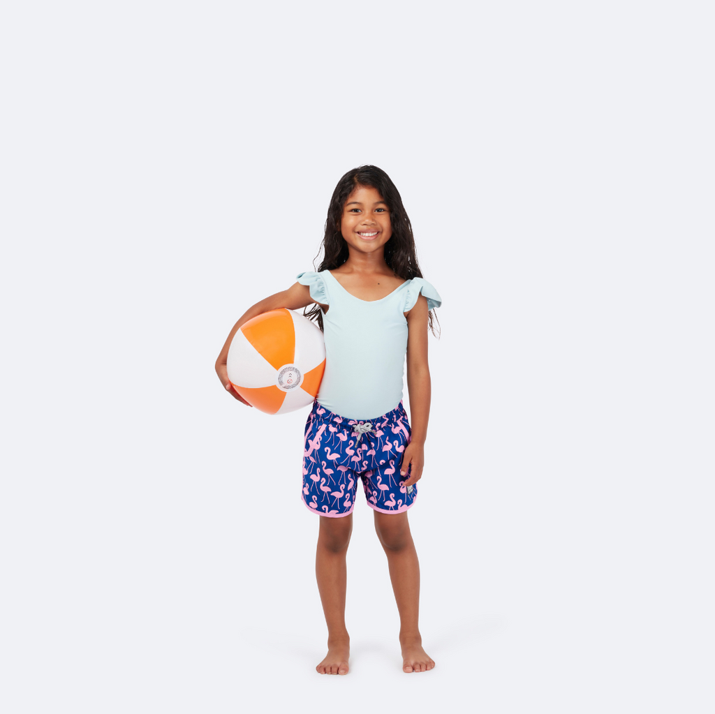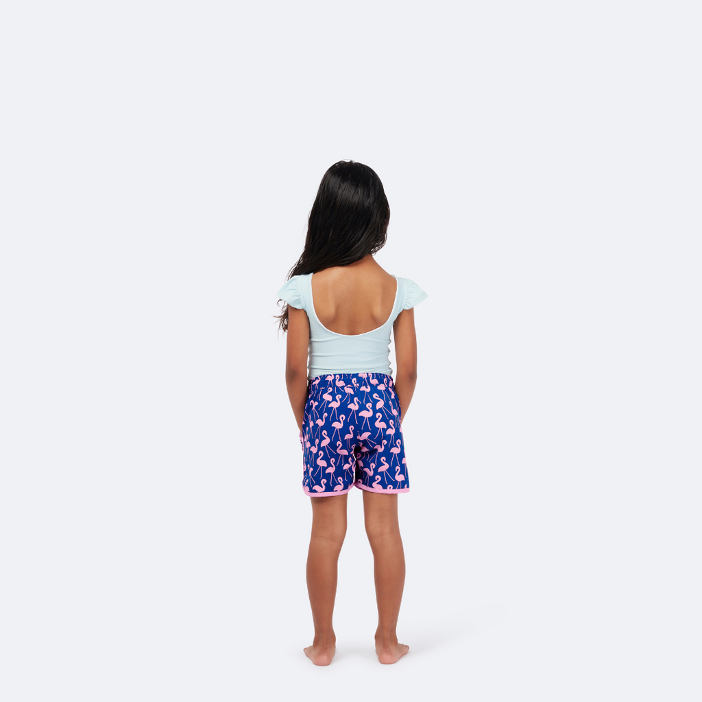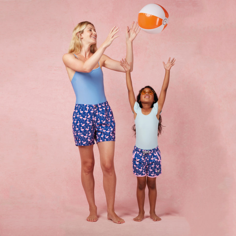 These Rose Flamingos swim shorts will bring a tropical-island vibe to her hot-day wardrobe. The neat print, in flattering navy and rose-pink, makes them the ideal wear-all-day shorts for in or out of the water, and the contrasting binding gives them a sporty edge. Perfect for a mom or dad (or both) match up!