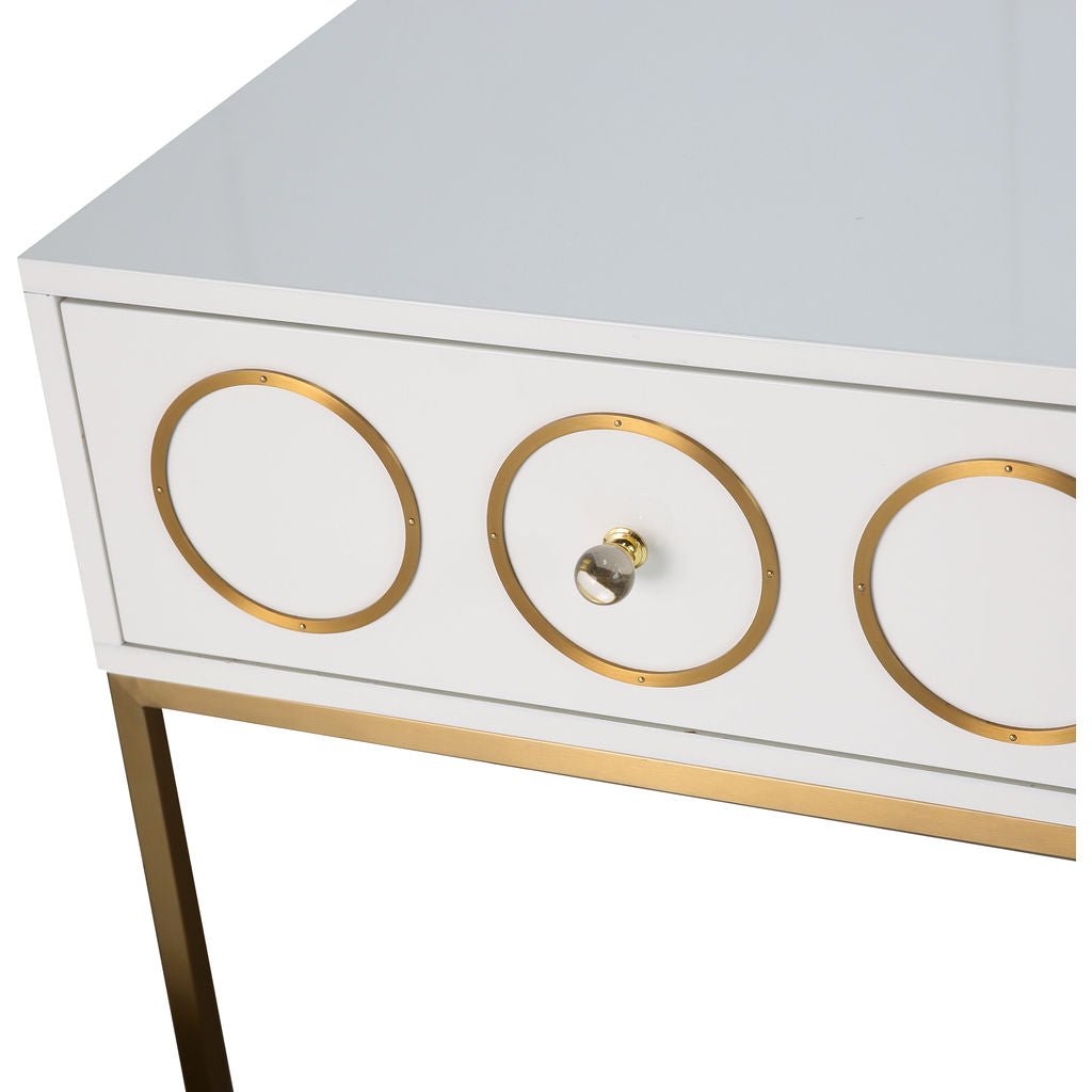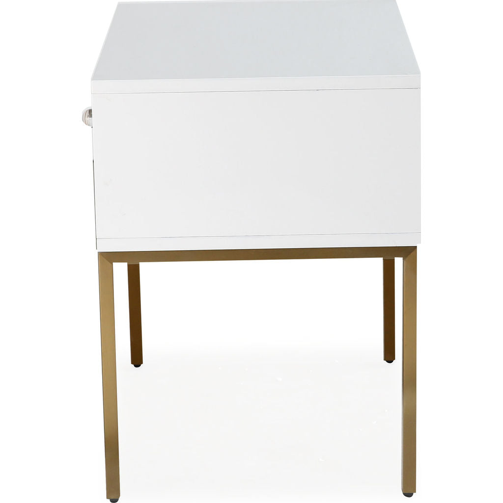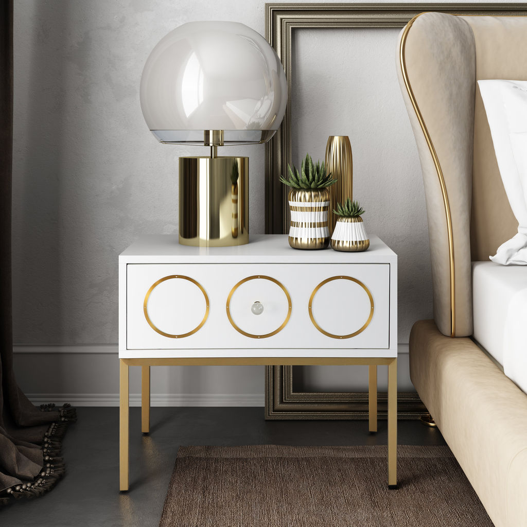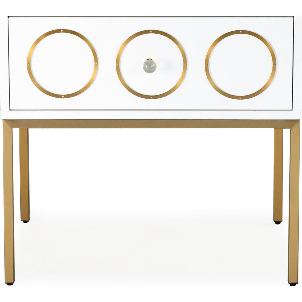 The TOV Furniture Ella Side Table in White/Gold is a mix of Mid-Century modern design and Hollywood glam. This side table was born to make a statement. Everyone is sure to love the brushed gold accents and the lucite hardware against the lacquered white finish. Use this piece in your bedroom to add an element of glamour.