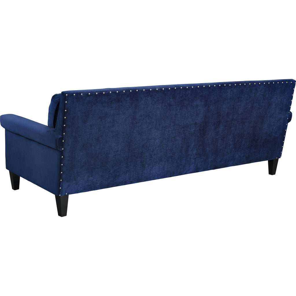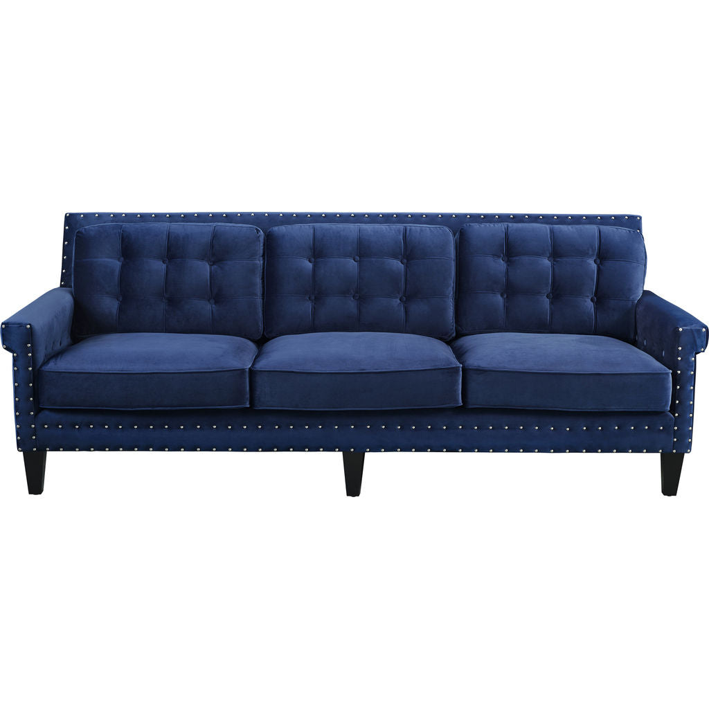 The Navy Jonathan Velvet Sofa is a simple classic. TOV Furniture created this comfortable couch to be the perfect addition to any room. The rich navy blue velvet is sure to go compliment any decor. Featuring a solid wood frame with weathered Oak legs, the hand-applied nailheads and tufting complete the look.
