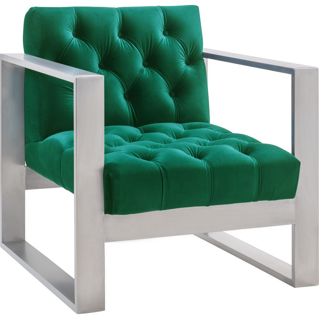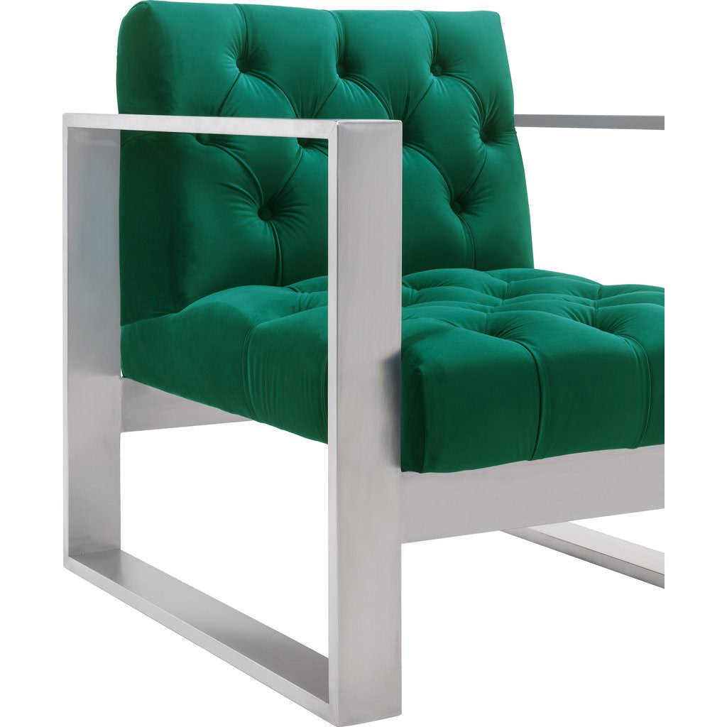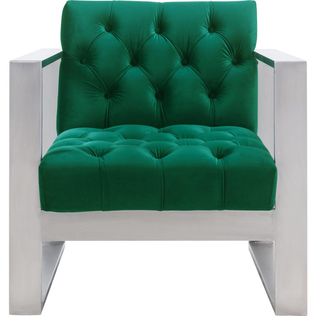 TOV Furniture blends modern elegance and comfort in the Oliver Velvet Side Chair. This gorgeous chair features a rich green velvet upholstery that is perfectly complemented by the stainless steel frame. Have this chair sitting pretty in the bedroom or living room for a pop of color and glam.