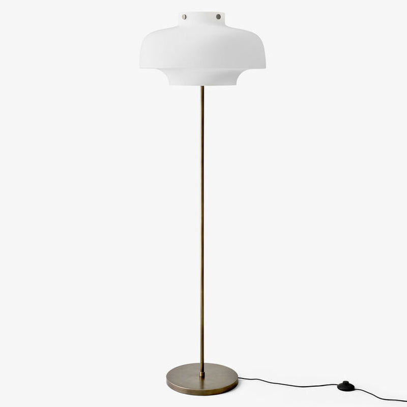 - The lamp shade is made from mouth blown opal glass and the base and stem are made from deep drawn and extruded metal